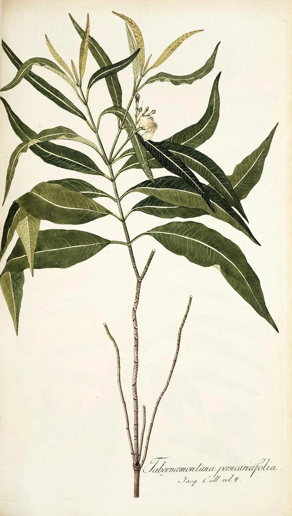 La reproduction de Tabernaemontana persicariaefolia est une invitation à explorer la richesse de la flore tropicale. Avec ses teintes éclatantes et ses formes harmonieuses, cette œuvre évoque la légèreté et la grâce des plantes. Les nuances de vert, de blanc et de jaune se mêlent avec délicatesse, créant un tableau vivant qui attire l'œil. La technique de l'artiste, qui allie précision scientifique et sensibilité artistique, permet de ressentir l'énergie vitale de cette plante. Chaque détail est soigneusement rendu, offrant une expérience visuelle immersive qui nous connecte à la beauté de la nature.