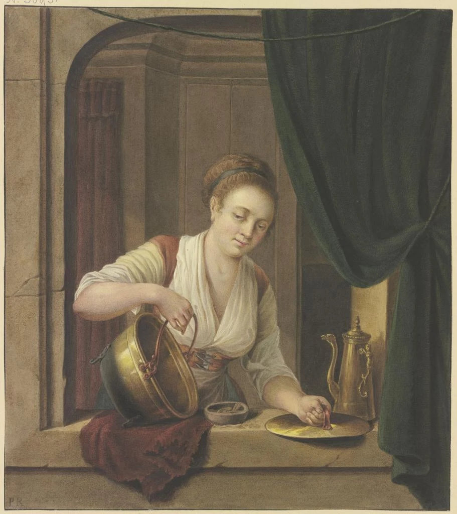 Un cuisinier récure la vaisselle à la fenêtre - Pieter Recco