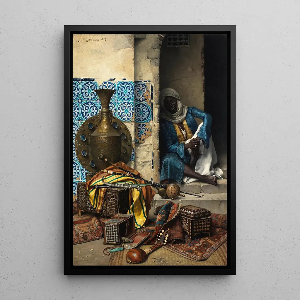 Cette reproduction d'Un marchand d'artefacts est une pièce décorative qui enrichit tout espace, qu'il s'agisse d'un salon, d'un bureau ou d'une bibliothèque. Sa qualité de reproduction assure une fidélité aux détails de l'œuvre originale, tout en apportant une touche d'exotisme et de sophistication à votre décor. L'attrait esthétique de cette toile, avec ses couleurs éclatantes et ses détails minutieux, en fait un choix idéal pour ceux qui souhaitent créer une ambiance chaleureuse et inspirante, tout en célébrant la beauté de l'art orientaliste.
