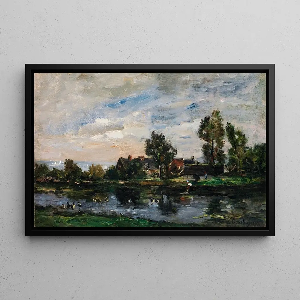 La reproduction Un paysage de Charles François Daubigny est une invitation à plonger dans un tableau vivant, où la nature s'épanouit sous nos yeux. Ce chef-d'œuvre, empreint de sérénité, dépeint des champs verdoyants et des ciels nuageux, capturant l’essence même de la campagne française. Les couleurs douces et les coups de pinceau fluides évoquent une atmosphère paisible, presque rêveuse. Daubigny, avec sa technique impressionniste, réussit à transmettre la lumière et l’air frais, permettant au spectateur de ressentir la tranquillité de ce paysage bucolique. Chaque élément de la toile semble respirer, créant une harmonie parfaite entre ciel et terre.