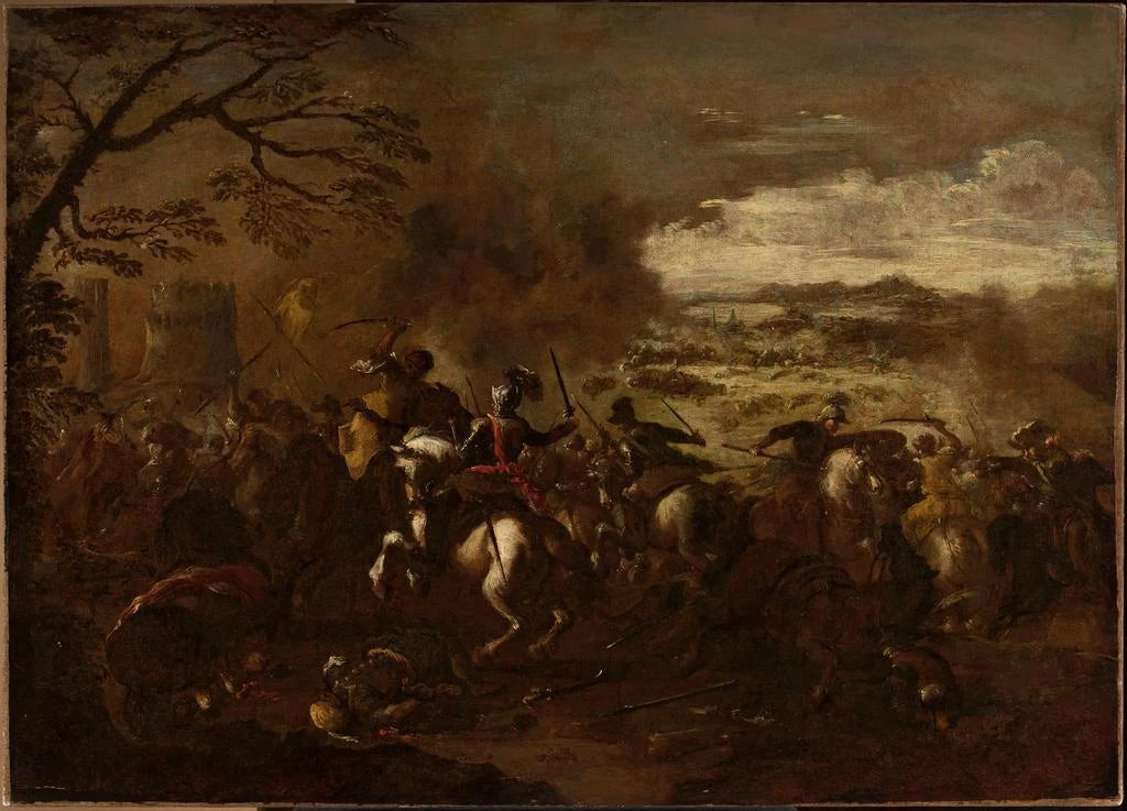 Francesco Simonini, actif au XVIIe siècle, est un artiste souvent associé au mouvement baroque, caractérisé par son dramatisme et son expressivité. Influencé par des maîtres tels que Caravage, Simonini développe un style unique qui allie réalisme et théâtralité. Bien que moins connu que certains de ses contemporains, son œuvre témoigne d'une grande habileté technique et d'une profonde compréhension des émotions humaines. En représentant des scènes de bataille, il s'inscrit dans une tradition artistique qui cherche à capturer l'essence même de l'expérience humaine, qu'elle soit héroïque ou tragique. Son héritage perdure à travers ses œuvres, qui continuent d'inspirer et de fasciner.