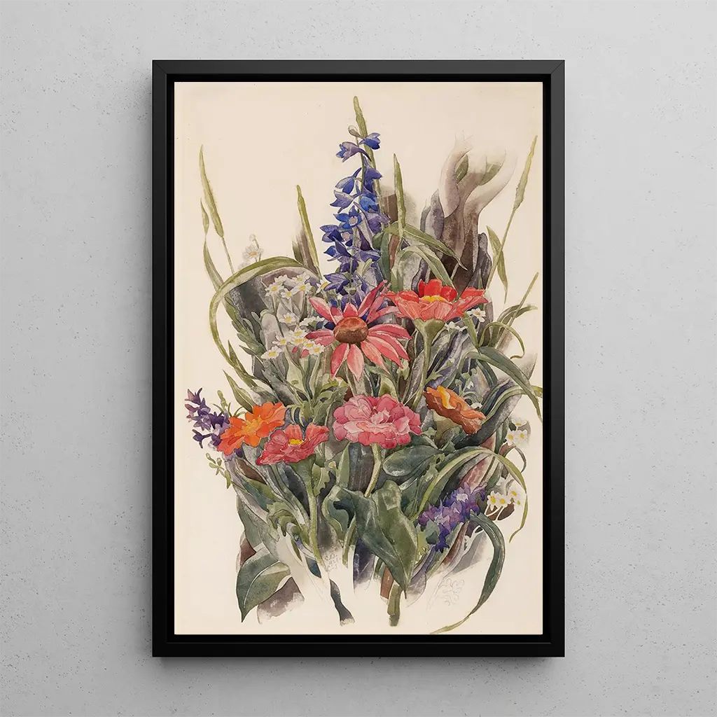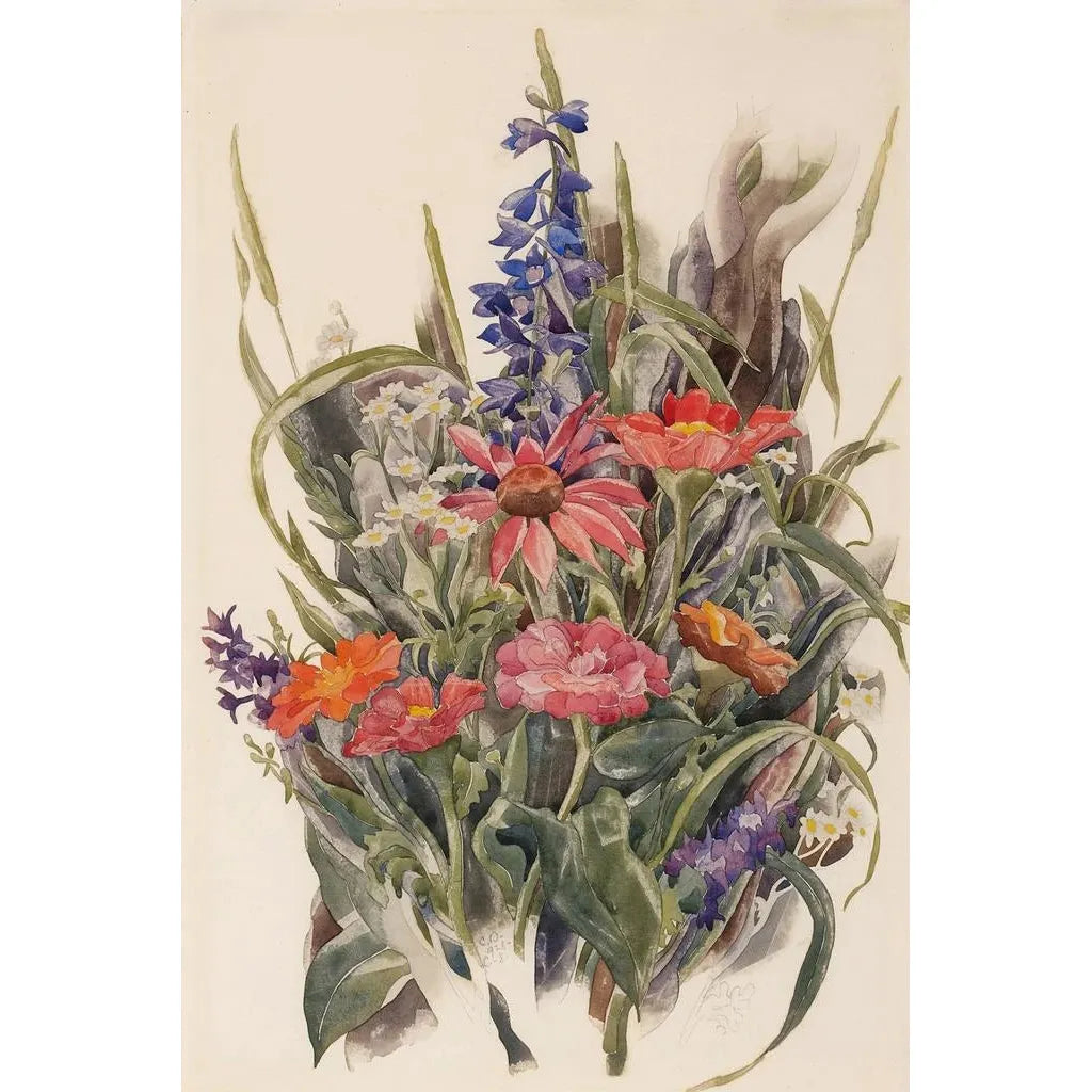 Dans cette œuvre vibrante, Charles Demuth capture la beauté éphémère des fleurs à travers une palette éclatante. Les zinnias, delphiniums et marguerites s’entrelacent avec une délicatesse saisissante, créant une composition harmonieuse qui invite à la contemplation. La technique de l’aquarelle, utilisée avec maestria, permet à la lumière de jouer sur les pétales, révélant des nuances subtiles qui évoquent la fraîcheur d’un jardin en pleine floraison. L’atmosphère générale de la toile est à la fois joyeuse et apaisante, transportant le spectateur dans un monde où la nature s’épanouit dans toute sa splendeur.