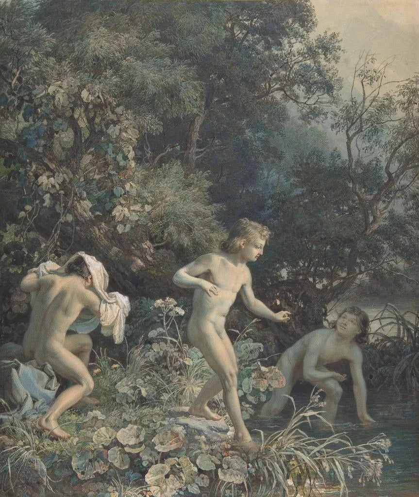 Kunstdruk | Aan de rand van de rivier met drie zwemmende jongens - Christian Friedrich Gille