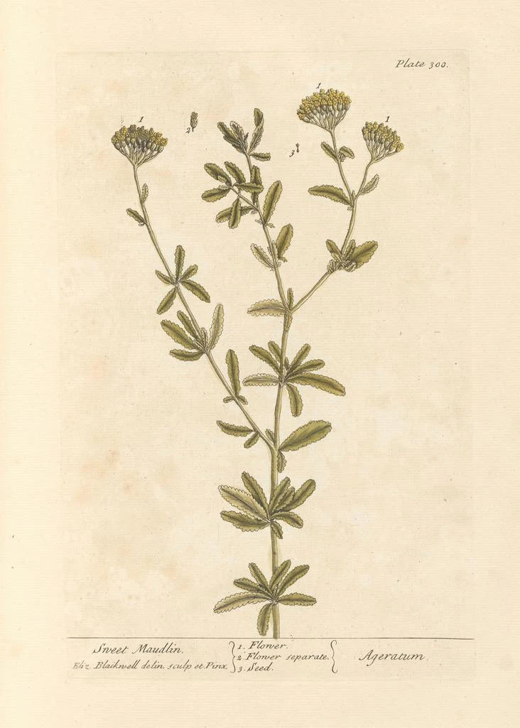 Elizabeth Blackwell, actief in de achttiende eeuw, is een van de eerste vrouwen die naam heeft gemaakt in het veld van de botanische kunstdruk. Geboren in Engeland, werd ze beïnvloed door de wetenschappelijke stromingen van haar tijd, met name de classificatiebeweging van planten. Haar kunstdruk, "Absinthe douce", maakt deel uit van een serie die erop gericht is het publiek te onderwijzen over medicinale planten en hun gebruik. Blackwell wist kunst en wetenschap te combineren, waardoor ze bijdroeg aan de verspreiding van botanische kennis. Haar werk wordt tegenwoordig erkend als een belangrijke mijlpaal in de geschiedenis van de kunstdruk, en markeert de opkomst van een artistiek gevoel dat ten dienste staat van de wetenschap.