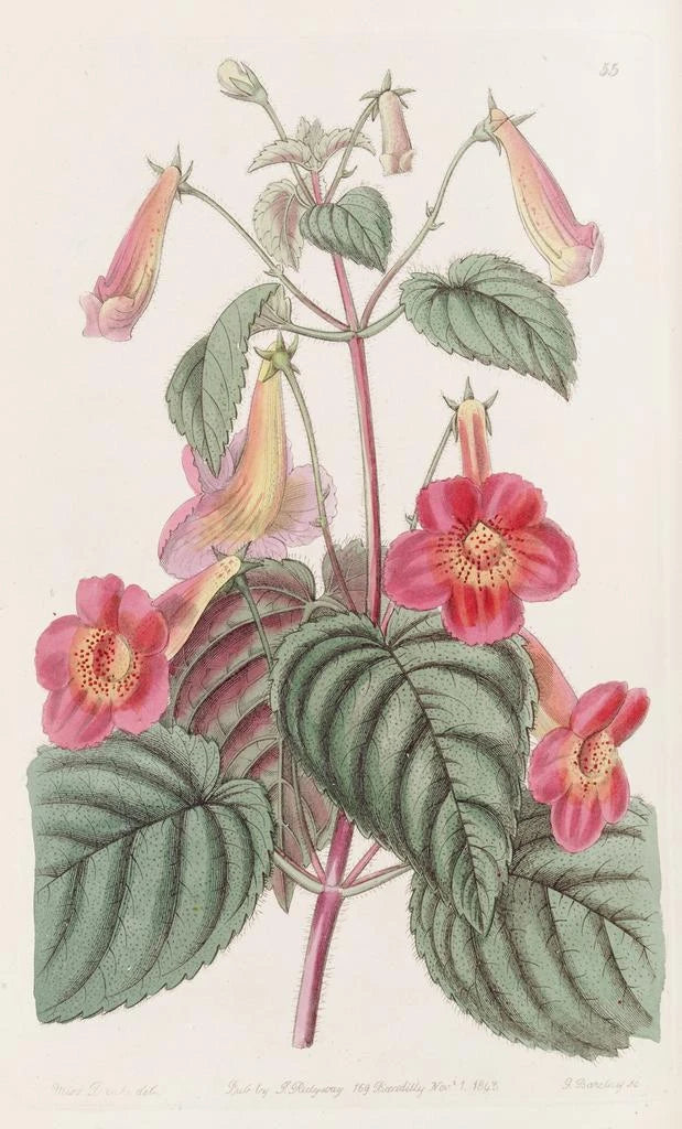 Sydenham Edwards, actief in het begin van de 19e eeuw, wordt erkend als een van de eerste botanische illustrators van zijn tijd. Geïnspireerd door de wetenschappelijke ontdekkingen van zijn tijd, wist hij precisie en esthetiek te combineren in zijn werken. Zijn stijl wordt gekenmerkt door een nauwgezette aandacht voor details en een vakkundig gebruik van kleuren, waardoor hij zich onderscheidde in het veld van de illustratie. "Achimène velue" getuigt van zijn inzet voor een getrouwe weergave van de flora, terwijl hij een artistieke dimensie toevoegt die de eenvoudige wetenschappelijke illustratie overstijgt.