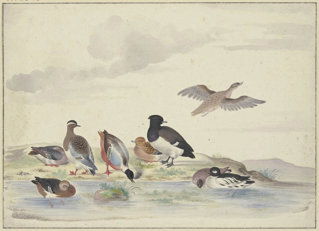 Acht eenden van verschillende soorten aan de waterkant - Pieter Holsteijn