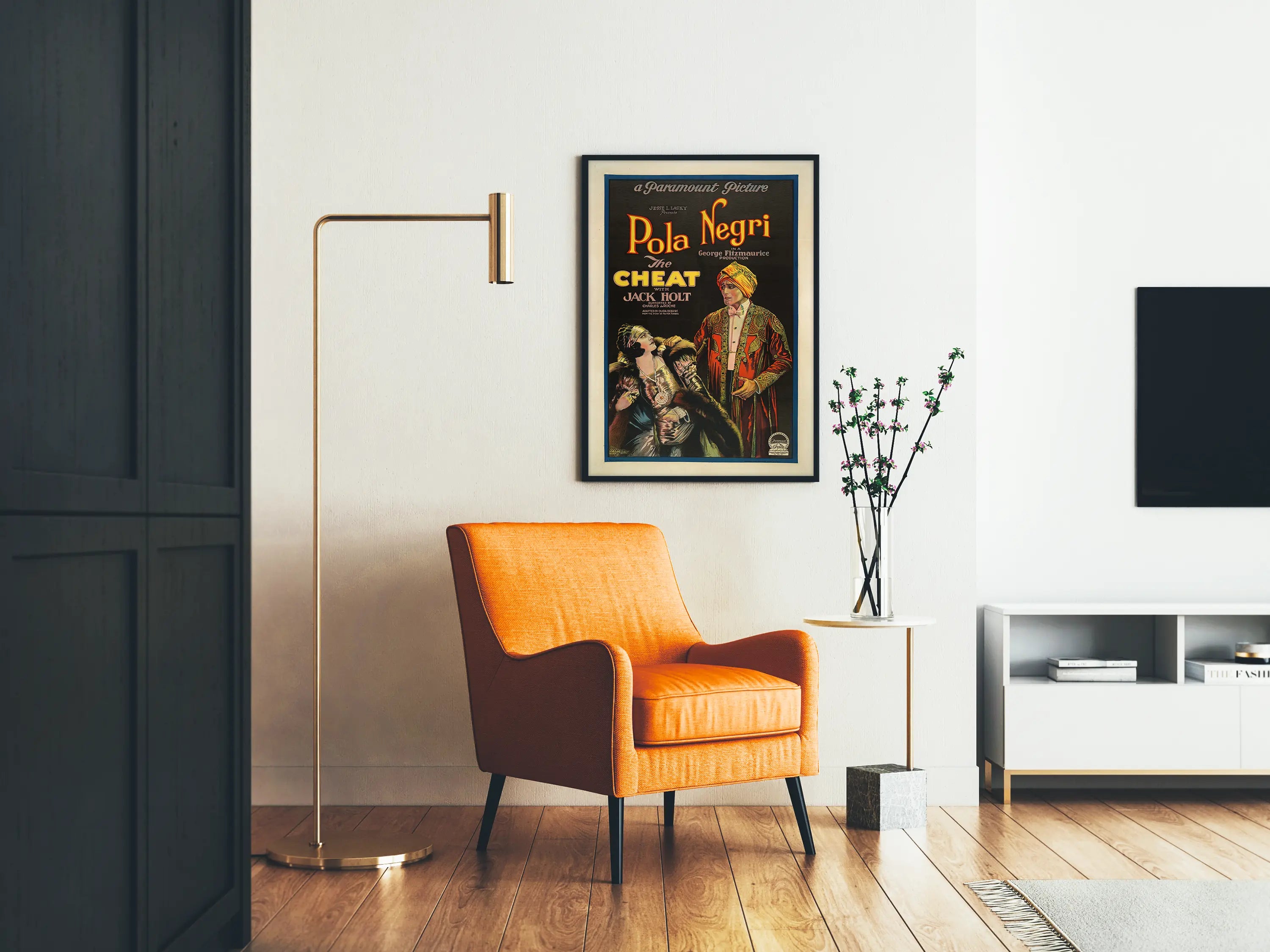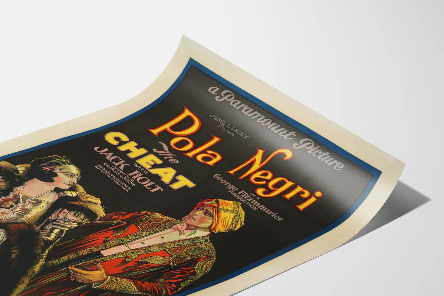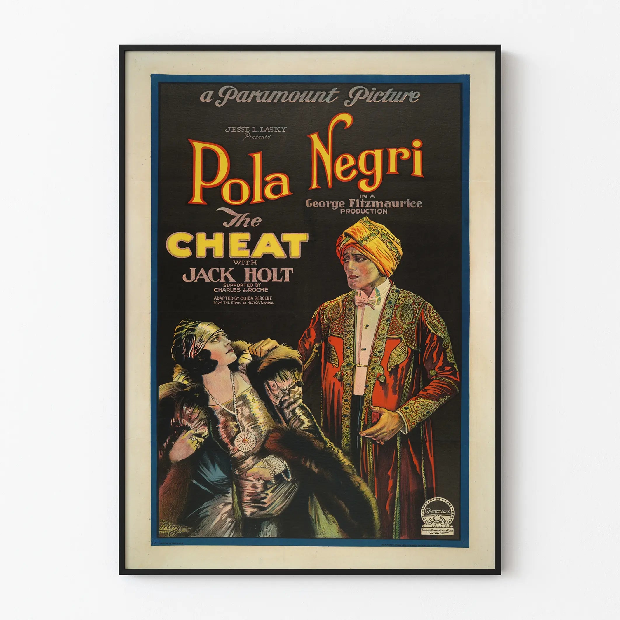 Deze vintage filmposter getiteld "The Cheat" toont actrice Pola Negri in een artistieke stijl vol details en kleuren. Ze wordt gekenmerkt door haar levendige kleuren en retro-esthetiek, typerend voor filmaffiches uit de eerste decennia van de cinema. Op de poster zien we twee personages gekleed in elegante en theatrale kleding: een vrouw met een bontjas en een man met een tulband en een rijk versierde jas. Het contrast tussen de zwarte achtergrond en de intense kleuren van de kostuums trekt de aandacht, waardoor deze poster een opvallend wanddecoratie-element is. Deze affiche past perfect in een interieur dat de historische beeldende kunsten of de thema's van de klassieke cinema waardeert. Als wanddecoratie voegt hij een vleugje elegantie en nostalgie toe aan elke ruimte, of het nu een woonkamer, kantoor of een ontspanningsruimte is. Het verticale formaat is ideaal om in te lijsten of gewoon op te hangen, waardoor het gedetailleerde grafische ontwerp en de karakteristieke typografie uit die tijd goed tot hun recht komen. Deze vintage filmposter is ook een verzamelobject voor liefhebbers van klassieke films en grafische kunst. Het aan de muur creëren van een unieke sfeer, die filmcultuur en decoratieve verfijning combineert. Ze sluit perfect aan bij een wereld waarin men streeft naar een samensmelting van filmgeschiedenis en karakteristieke wanddecoratie.