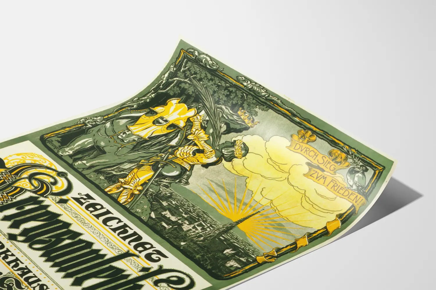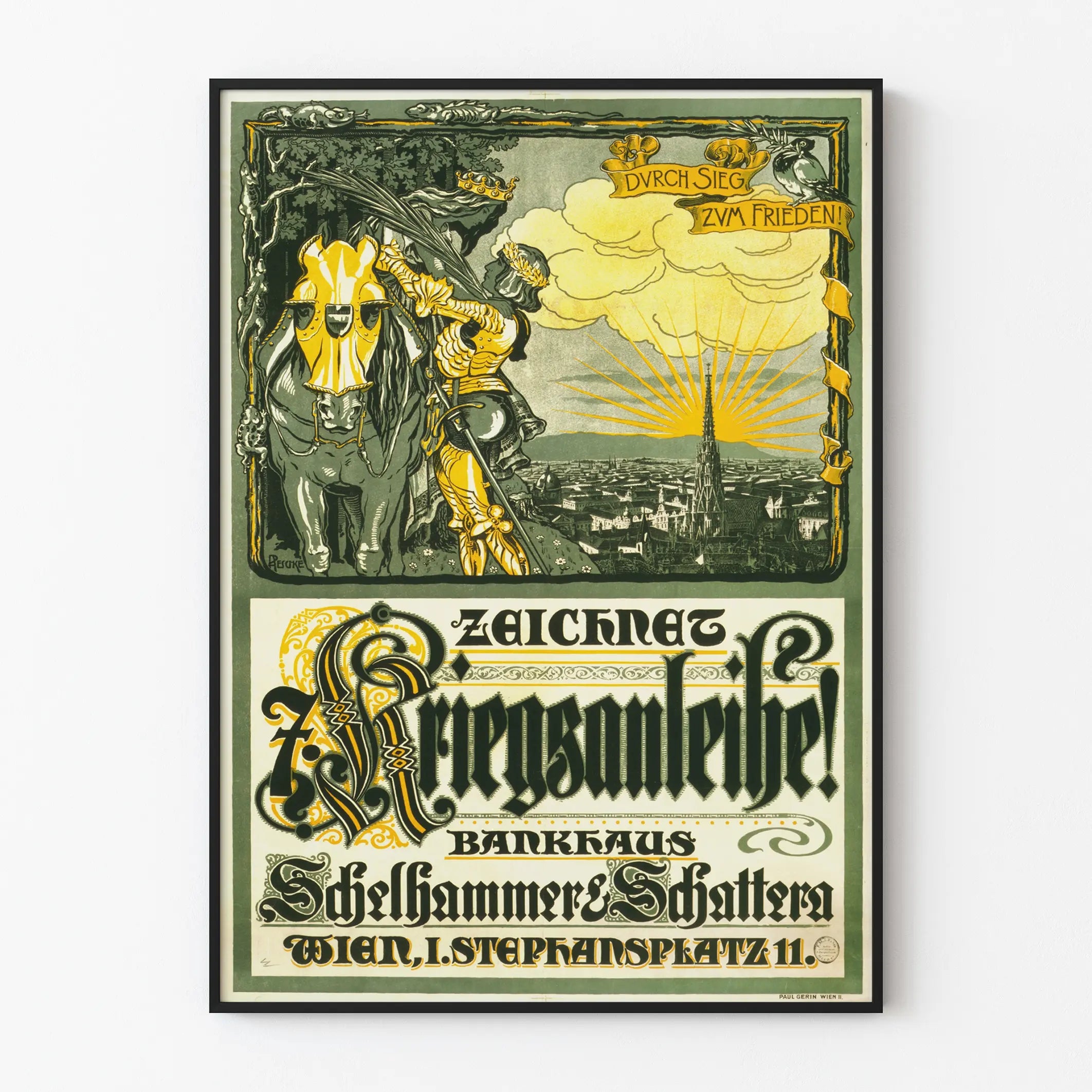 Deze vintage poster is een opvallend stuk muurdecoratie, ideaal voor liefhebbers van geschiedenis en grafisch ontwerp uit vervlogen tijden. Het beeldt een symbolische scène af, met een paard dat een gouden harnas draagt, vergezeld door een ridder in volledig harnas, gewapend met een lans versierd met een lauwerkrans als verwijzing naar de overwinning. De achtergrond toont een stad met een toren die de horizon domineert, verlicht door de stralen van een opkomende zon, symbool van hoop en toekomstige vrede. De lijst is versierd met donkere motieven, aangevuld met kleine schedelkoppen op de bovenrand, wat de historische en dramatische context van de affiche versterkt. In de rechterbovenhoek draagt een gele lint de inscriptie "DVRCH SIEG ZVM FRIEDEN!", wat in het Duits betekent: "Door de overwinning naar de vrede!". De hoofdtekst "Zeichnet Kriegsanleihe!" nodigt uit tot het onderschrijven van een oorlogsobligatie. Deze elementen maken van deze poster een geëngageerd en patriottisch kunstwerk, typerend voor de visuele propaganda tijdens de Eerste Wereldoorlog. De grafische stijl, gekenmerkt door een zeer uitgewerkte gotische typografie en een kleurenpalet beperkt tot geel, zwart en groen, biedt een retro-esthetiek die zeer gewild is voor authentieke muurdecoratie. Deze poster is perfect om een historische en artistieke toets aan een interieur te geven, of het nu in een kantoor, woonkamer of bibliotheek is. Zeer geschikt als verzamelobject of voor liefhebbers van militaire en grafische kunst uit het begin van de twintigste eeuw. Door dit kunstwerk bij u thuis te tonen, kiest u voor een krachtige muurdecoratie vol symboliek en emotie, die kunst, geschiedenis en vintage design combineert.