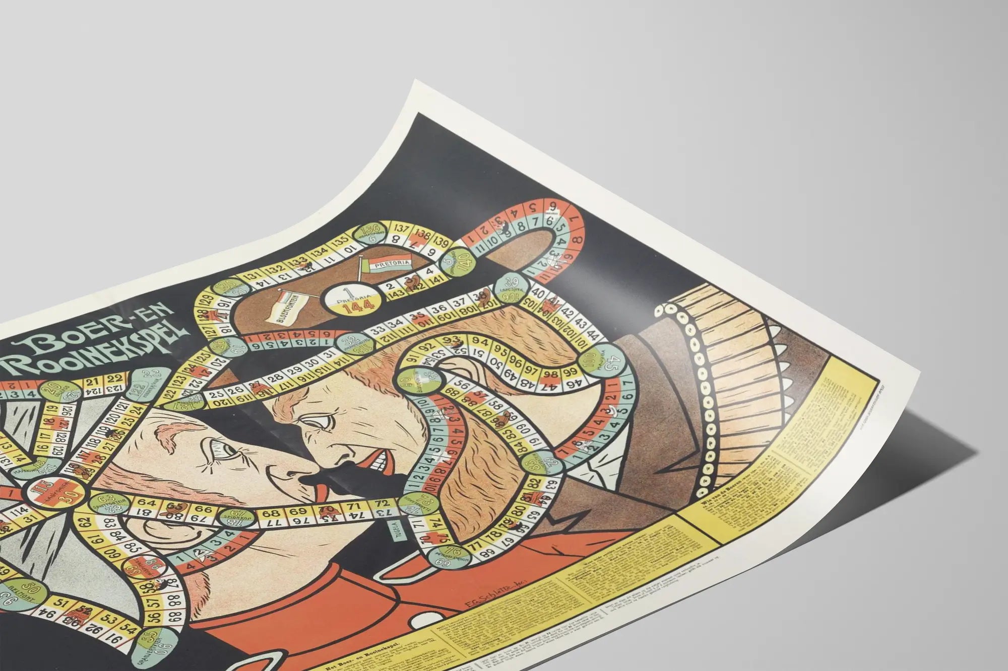 Cette affiche vintage représente un jeu de société intitulé "Boer en Rooiniekspel", un véritable élément de décoration murale qui invite au voyage dans le temps. L'affiche présente deux portraits stylisés se faisant face, l'un à gauche portant un chapeau militaire et l'autre à droite avec une barbe fournie, tous deux entourés d'un parcours de jeu en spirale composé de cases numérotées de différentes couleurs (jaune, rouge, bleu et vert). Chaque case semble indiquer une étape ou un événement lié au jeu, avec quelques symboles et petits dessins en lien avec le thème. Ce poster offre un mélange unique d'illustration graphique et de ludisme qui s'intègre parfaitement dans un espace dédié à la décoration murale originale et historique. L'aspect graphique soigné et les couleurs douces contribuent à créer une ambiance rétro et un effet vintage très marqué, idéal pour enrichir un intérieur avec une touche d'authenticité et d'histoire. Ce type d'affiche peut particulièrement séduire les amateurs de jeux anciens, de culture populaire ou encore de pièces décoratives à forte valeur visuelle. L'inscription en néerlandais ajoute un charme international supplémentaire à cette pièce, rendant l'affiche originale pour une décoration murale thématique ou collection. Le poster est également un excellent choix pour ceux qui souhaitent ajouter un élément narratif à leur décoration, combinant esthétique artistique et passion pour les jeux de société traditionnels. Que ce soit dans un salon, une bibliothèque ou une salle de jeux, cette affiche saura capter le regard et susciter la curiosité grâce à son design unique et son univers graphique riche en détails. En somme, cette décoration murale est une invitation à la convivialité et à la redécouverte des jeux classiques à travers une œuvre visuelle authentique.