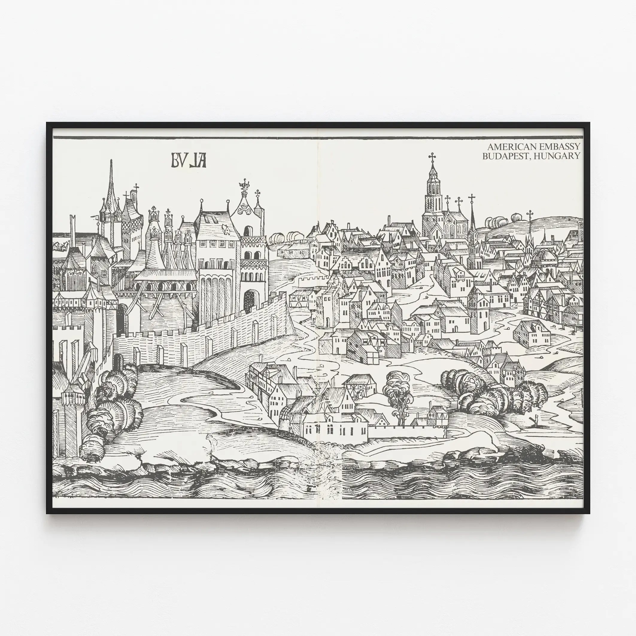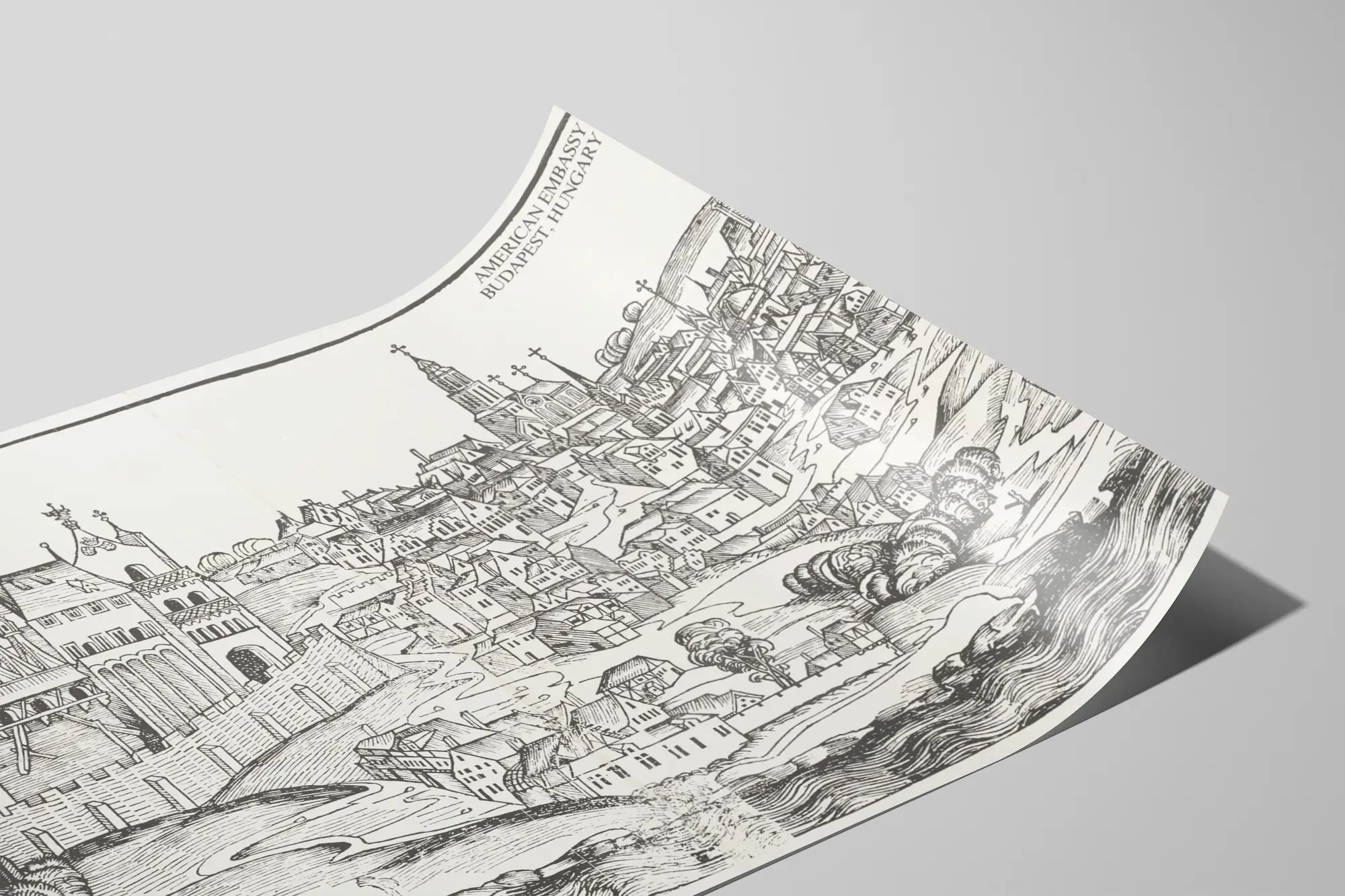 Cette affiche vintage représentant l'ambassade américaine à Budapest, en Hongrie, est une décoration murale parfaite pour les amateurs d'art et d'histoire. Le dessin en noir et blanc dévoile une illustration détaillée et architecturale, semblable à une gravure ancienne, mettant en valeur les toits, clochers et bâtiments emblématiques d'une ville historique. Cette décoration murale évoque un charme rétro et une atmosphère européenne qui apportent une touche culturelle et élégante à tout intérieur. Que ce soit pour un salon, un bureau ou une bibliothèque, ce poster trouve naturellement sa place dans une ambiance classique ou personnalisée.