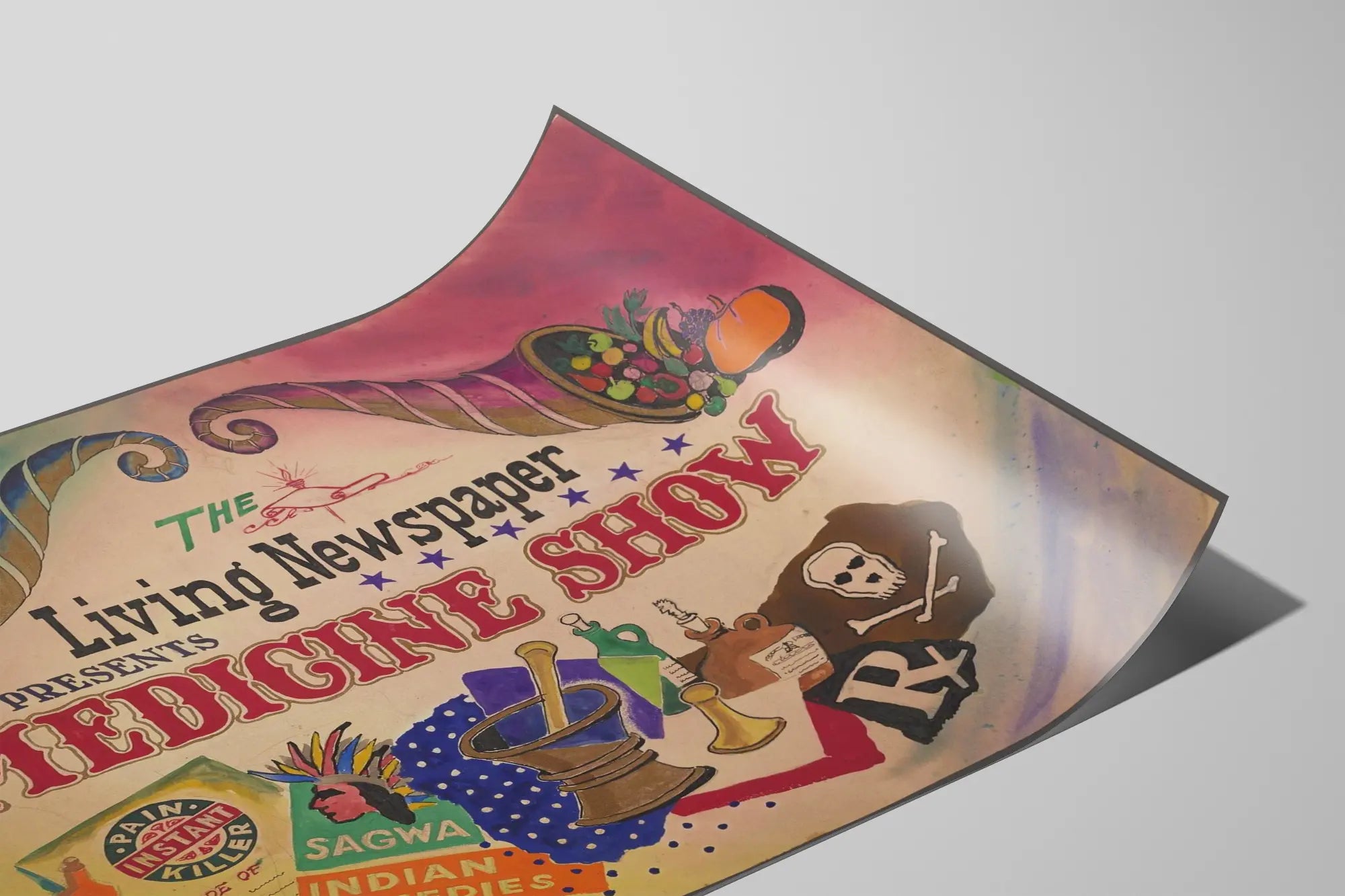 Deze vintage poster getiteld « The Living Newspaper Presents Medicine Show » is een prachtig voorbeeld van muurdecoratie in retrostijl. Ze beeldt kleurrijk en geïllustreerd een voorstelling van traditionele en patapharmaceutische remedies, algemeen bekend als "medicine shows". De poster toont een reeks iconografische elementen, zoals een hoorn des overvloeds gevuld met fruit en groenten aan de rechterkant, terwijl de linkerhoorn is gevuld met flessen, doosjes en flesjes, wat een mengeling suggereert van traditionele geneeskunde en diverse toverdranken. In het midden van de poster ligt een vijzel en stamper, krachtige symbolen verbonden met de kunst van het bereiden van remedies en toverdranken. Andere voorwerpen, zoals flesjes, een zak met een schedel en gekruiste botten, en documenten versterken de mysterieuze en oude sfeer van deze volksgeneeskundige voorstelling. De grote rode letters "MEDICINE SHOW" trekken onmiddellijk de aandacht, gecombineerd met de typische typografie van oude affiches, waardoor je wordt ondergedompeld in een nostalgische en authentieke sfeer. Deze muurdecoratie met de inscriptie « SAGWA INDIAN REMEDIES » suggereert ook een verwijzing naar planten en remedies van Indiase oorsprong, die het oude weten en medicinale planten oproepen die vaak worden gebruikt in alternatieve geneeswijzen. Deze poster is ideaal ontworpen om een vleugje originaliteit aan je interieur toe te voegen, of het nu in een woonkamer, kantoor of vintage themawinkel is. De unieke grafische stijl en de zachte kleuren die geleidelijk van groen naar roze en geel verlopen, geven het een warme en esthetische uitstraling. Dit kunstwerk is perfect voor liefhebbers van muurdecoratie die een intrigerende en culturele sfeer willen creëren, waarbij de oude geschiedenis van volksremedies wordt gecombineerd met een geslaagd artistiek stijl. Kies voor deze poster om je collectie vintage posters te verrijken en een unieke en suggestieve decoratiestijl te accentueren.
