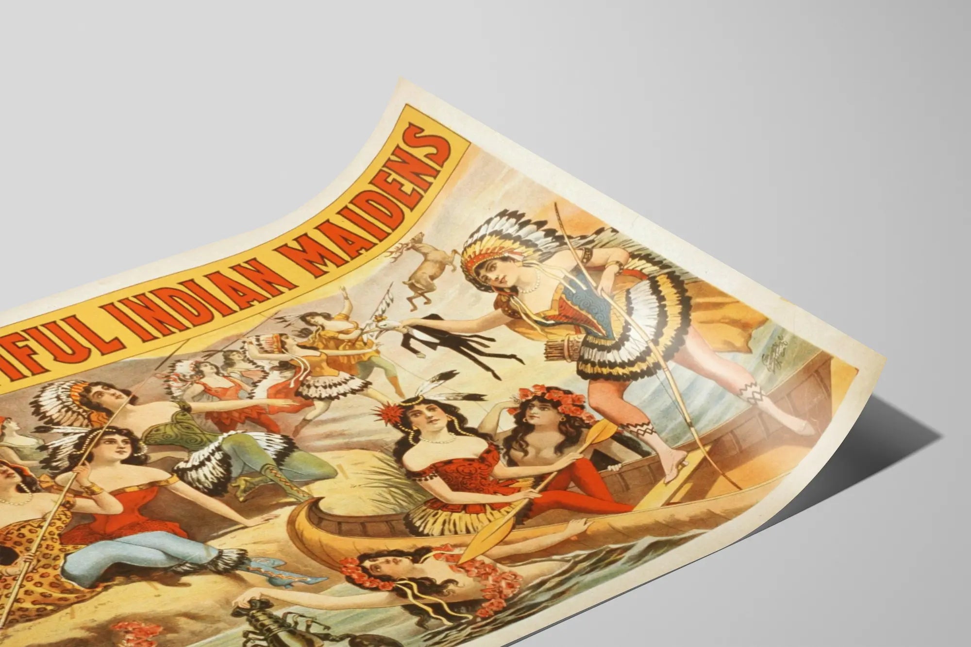 Ontdek dit vintage affiche getiteld "De prachtige Indiase meisjes", een muurdecoratie met een boeiende retrostijl. Deze kleurrijke poster toont een menigte jonge vrouwen gekleed in kostuums geïnspireerd op klassieke inheemse Amerikaanse kleding, versierd met veren en traditionele accessoires, in een rijke en dynamische compositie. De illustratie toont een groep van deze jonge vrouwen in verschillende poses en activiteiten, sommige aan het roeien in een boot, anderen aan de oever of in het water, allemaal samengebracht in een denkbeeldige wereld die natuur en folklore combineert. Dit wandpaneel is ideaal om een vleugje originaliteit en geschiedenis aan uw interieur toe te voegen, door te spelen met nostalgie en de esthetiek van oude reclameborden. Met zijn warme kleuren en gedetailleerde afwerking past deze muurdecoratie perfect in een woonkamer, kantoor of recreatieruimte, voor een vintage en artistieke sfeer. Dit affiche is een decoratief stuk dat liefhebbers van oude grafische kunst, etnische motieven en geïllustreerde natuurlijke scènes zal bekoren.