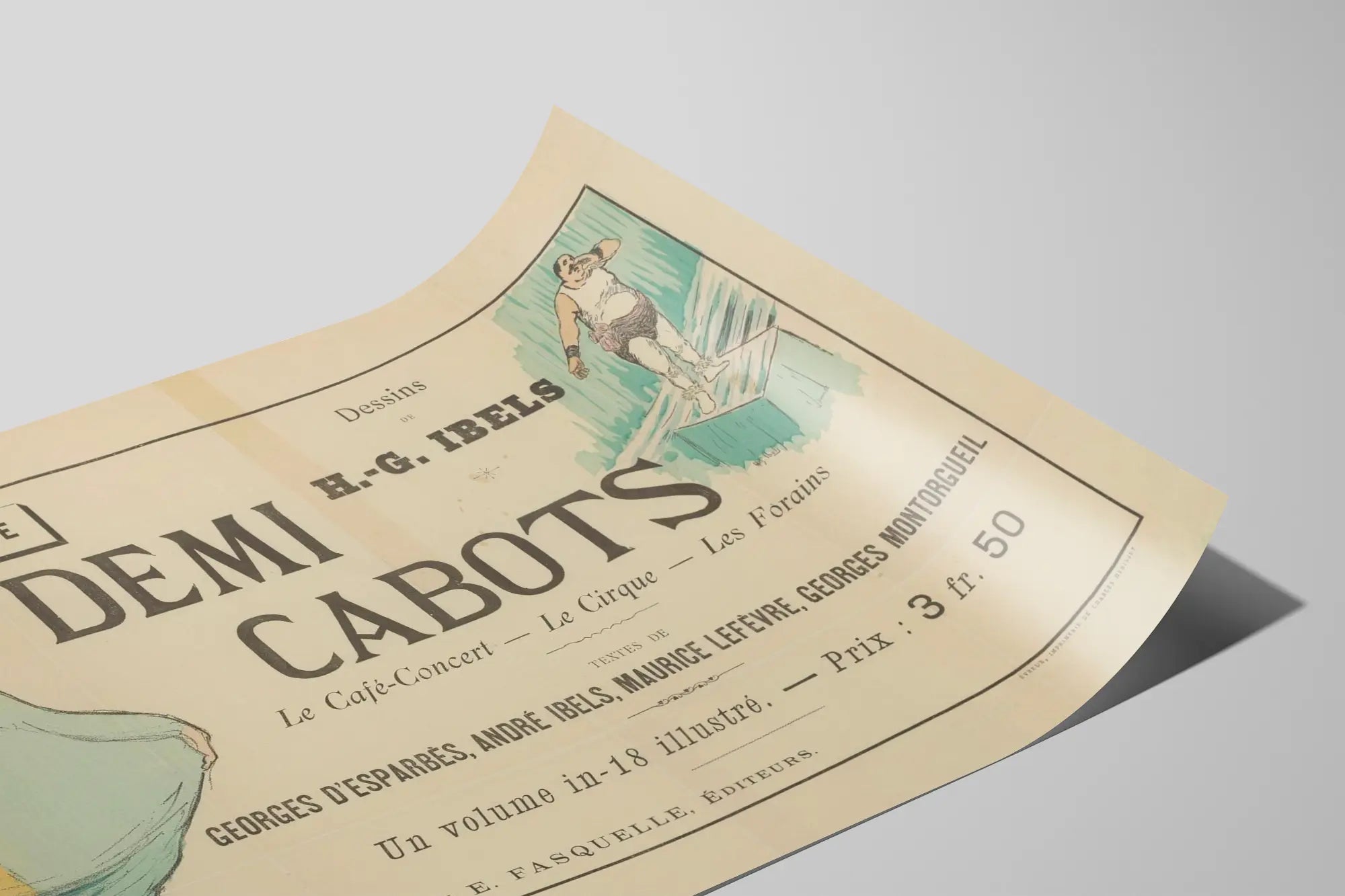 Cette affiche vintage intitulée « Demi Cabots » est une pièce de décoration murale qui évoque avec style l’univers du spectacle populaire du début du XXe siècle. Illustrée par H.-G. Ibels, cette affiche met en avant les thèmes emblématiques du café-concert, du cirque et des forains, capturant l’essence vivante et animée de ces milieux festifs et artistiques. Ce poster original se distingue par son style graphique délicat mêlant des traits dessinés précis et des touches de couleur subtilement apposées, apportant une ambiance chaleureuse et nostalgique à toute pièce où il serait exposé. Destinée à devenir une décoration murale remarquable, cette affiche se compose de dessins expressifs mettant en scène des personnages caractéristiques du café-concert et du cirque. On y devine la silhouette d'un artiste en costume coloré et celle d’un lutteur sur scène, symbolisant la diversité des attractions foraines. Les textes associés, signés par Georges d'Esparbès, André Ibels, Maurice Lefèvre et Georges Montorgueil, ajoutent une dimension littéraire et culturelle à cette création graphique. Cette affiche représente une superbe touche d’originalité pour tout intérieur cherchant à évoquer l’atmosphère festive des spectacles populaires français d’autrefois. Parfaite pour les amateurs de décoration murale qui apprécient l’art du dessin et le charme du vintage, elle trouve naturellement sa place dans un salon, un bureau ou une salle dédiée à la culture. Que vous soyez passionné de graphisme ancien, de l’histoire du spectacle ou simplement à la recherche d’une affiche décorative unique, cette création vintage « Demi Cabots » avec ses références au café-concert, au cirque et aux forains s’intègre parfaitement dans une collection ou en tant qu’élément décoratif central. Elle contribue à redonner vie aux ambiances historiques tout en apportant une pointe d’élégance et d’authenticité à votre décoration murale.