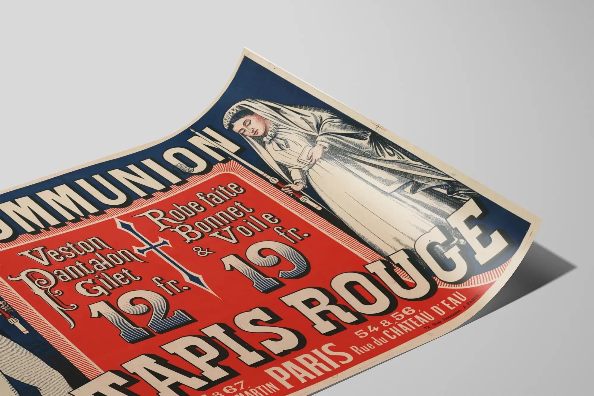 Deze vintage poster illustre een reclame voor Eerste Communie-kleding, met een jongen en een meisje gekleed respectievelijk in een kostuum en een feestjurk, typisch voor de eerste religieuze communie. Op een contrasterende blauwe en rode achtergrond toont ze de artikelen die worden aangeboden in de winkel Bij Het Rode Tapijt, gelegen aan de 65-67 rue du Faubourg Saint-Martin in Parijs. De jongen draagt een jas, broek en vest, terwijl het meisje een jurk met hoed en sluier draagt, ieder met een kaars, symbolen van deze viering. Deze oude reclameposter combineert gestileerde grafische elementen met sterke, decoratieve typografie, kenmerkend voor affiches uit het begin van de twintigste eeuw.