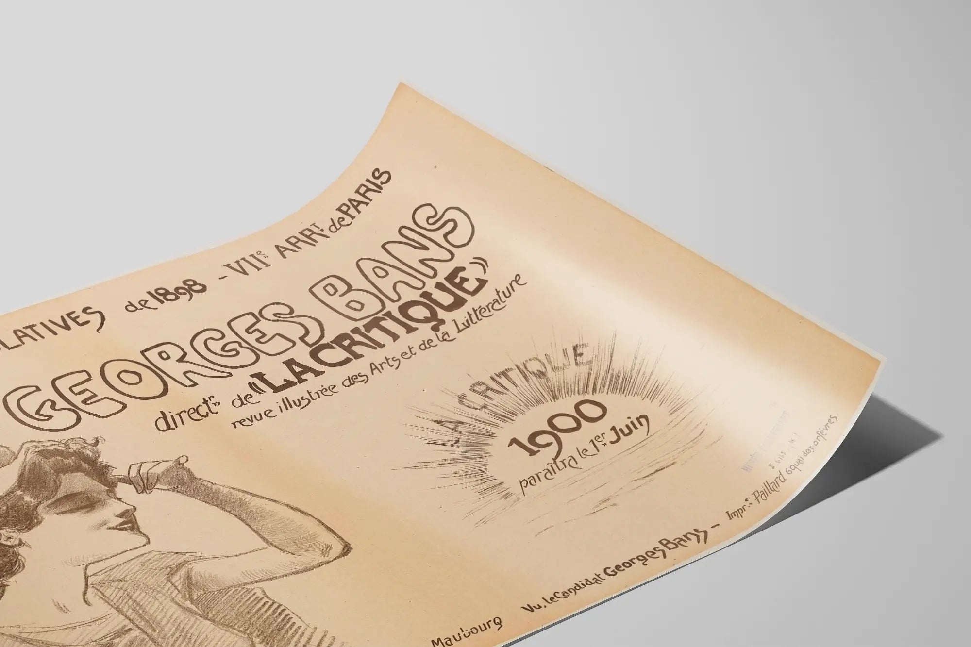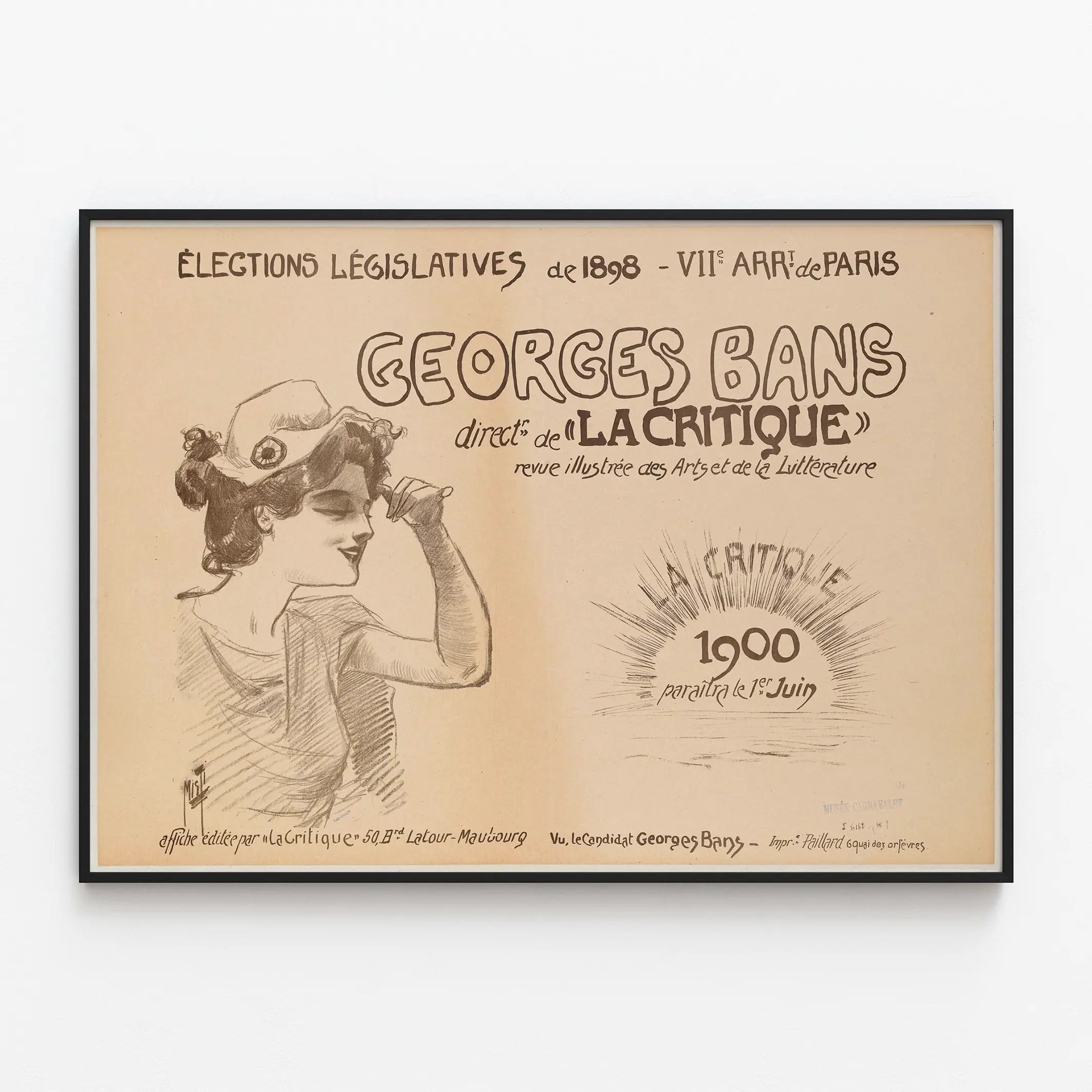 Cette affiche élégante et rétro annonce la campagne pour les élections législatives de 1898 dans le VIIe arrondissement de Paris. Elle met en avant Georges Bans, directeur de la revue illustrée « La Critique », une publication consacrée aux arts et à la littérature. Le style graphique est caractéristique de la fin du XIXe siècle avec une illustration au crayon représentant une femme souriante coiffée d'un béret, évoquant le charme et l'esprit artistique de l'époque. Le texte manuscrit en haut précise la nature de l'événement électoral, tandis que l'effet de rayons lumineux accompagnant la mention « La Critique 1900 paraîtra le 1er Juin » promet la continuité de la revue dans le futur. Cette affiche est une pièce de décoration murale idéale pour les amateurs d’histoire politique, des arts graphiques anciennes ou du Paris d’antan. Elle apportera une touche authentique et vintage à un intérieur, qu’il s’agisse d’un bureau, d'un salon ou d’une bibliothèque. Parfaite en poster ou en impression sur papier d’art, cette représentation artistique offre une fenêtre visuelle sur un moment clé de la vie culturelle et politique française à la fin du XIXe siècle.