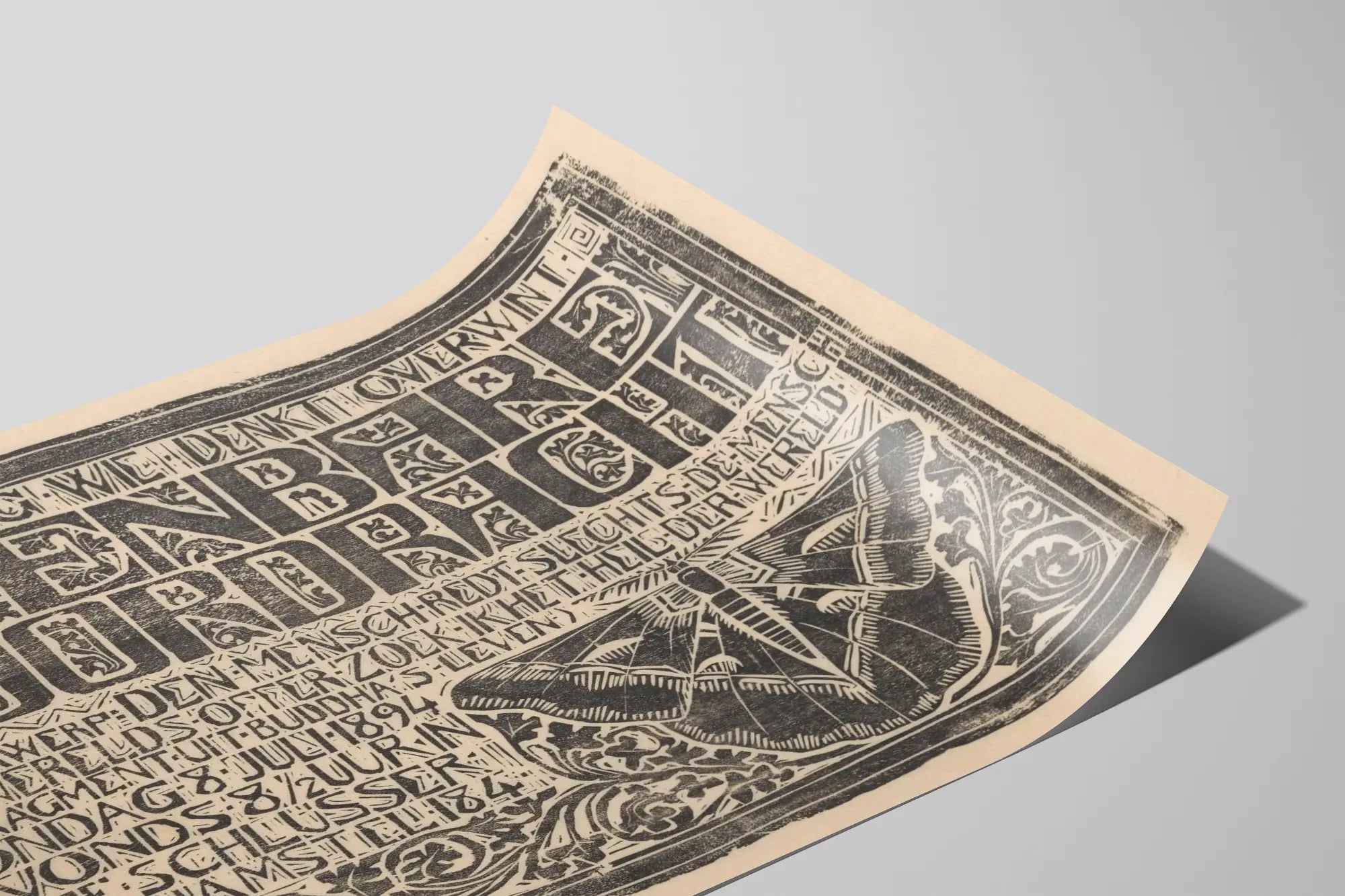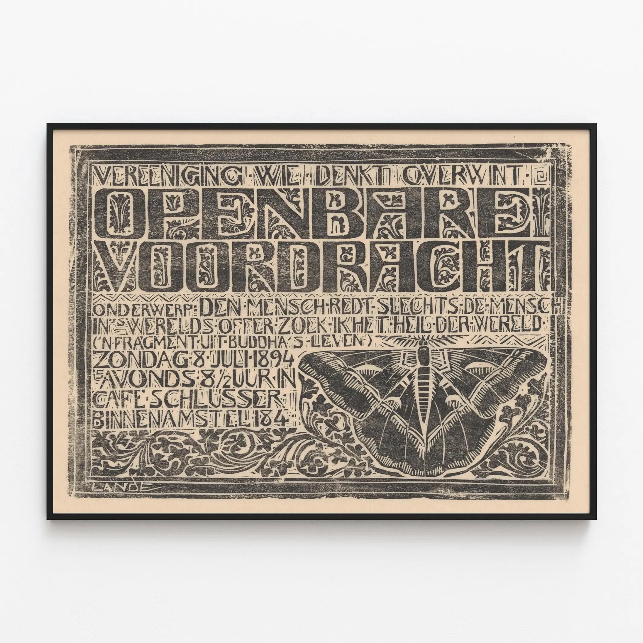 Cette affiche vintage en linogravure est une pièce graphique saisissante, parfaite pour une décoration murale au style rétro et artisanal. Elle présente un format rectangulaire avec un fond beige patiné, donnant un aspect authentique et ancien. Le design est composé d'un texte en néerlandais gravé en caractères majuscules épais, entouré d’un encadrement ornemental, et accompagné d’un papillon stylisé en bas à droite, symbole souvent associé à la transformation et à la nature. La gravure sur bois met en valeur le relief et la texture, apportant une dimension artistique et manuelle à cette décoration murale. Ce poster se distingue par son charme typographique et son motif délicat, rendant hommage à l’art graphique classique et à l’esthétique vintage. Il sera idéal pour habiller un mur en apportant une touche culturelle et historique, tout en s’intégrant harmonieusement dans des intérieurs contemporains ou rustiques. Que ce soit dans un salon, un bureau ou une librairie, ce tableau mural invite à la réflexion avec ses inscriptions, tout en décorant l’espace avec élégance. Son effet monochrome ainsi que sa composition équilibrée en font un objet décoratif qui capte l’attention sans surcharger l’ambiance. Ce type d’affiche originale s’adresse aux amateurs de linogravure, de typographie d’époque et d’œuvres murales au style artisanal, souhaitant enrichir leur intérieur avec une pièce à la fois esthétique et pleine de caractère. Découvrez une décoration murale qui allie art traditionnel et inspiration naturelle, pour un rendu unique et authentique.