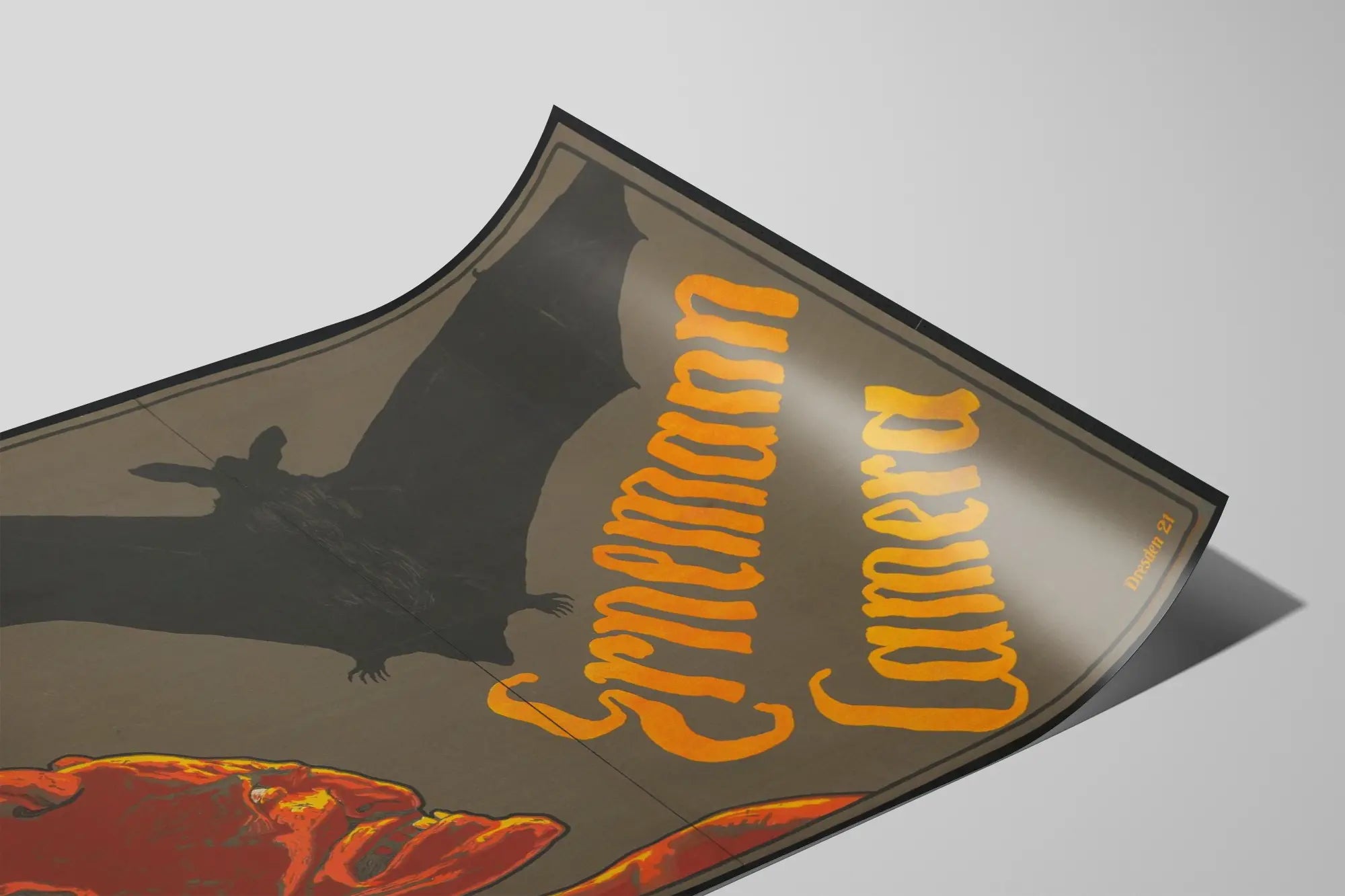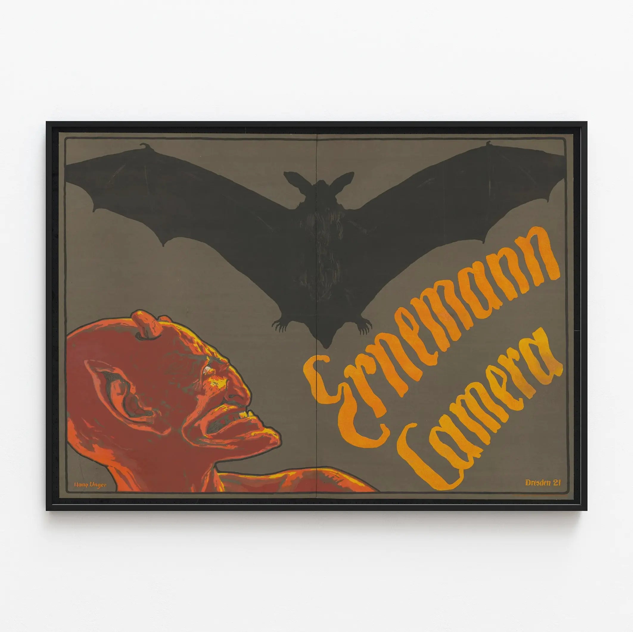 Cette affiche vintage Ernemann Camera attire immédiatement le regard grâce à son illustration saisissante et originale. Elle présente un visage démoniaque rouge vif, contrastant fortement avec le fond gris, tandis qu'une grande chauve-souris noire aux ailes déployées domine la scène. Les lettres du nom « Ernemann Camera » sont inscrites en diagonale dans une typographie stylisée et colorée en jaune orangé, créant un effet dynamique et rétro qui captive l'attention. Cette affiche se distingue par son esthétique sombre et puissante, idéale pour les amateurs de décoration murale qui recherchent un poster au style ancien et intrigant. Elle évoque une ambiance mystérieuse et gothique, parfaite pour agrémenter un espace dédié à la photographie, à l'art ou même à une collection de posters publicitaires d'époque. L'art graphique et le choix des couleurs offrent un équilibre entre tradition et audace, faisant de cette affiche un véritable objet déco qui s'impose dans n'importe quel intérieur. Elle s'adapte à un mur de salon, de bureau, ou d'atelier créatif, apportant une touche d'originalité et d'histoire. Opter pour cette affiche signifie choisir une décoration murale qui ne passe pas inaperçue, avec un design vintage frappant et une forte présence visuelle. Elle rappelle aussi l'importance historique des appareils photo anciens, sublimés ici par un graphisme puissant et expressif. Que ce soit pour compléter une collection thématique ou pour enrichir un espace personnel avec un poster artistique, cette affiche Ernemann Camera est une pièce maîtresse. Elle attirera aussi bien les passionnés de photographie que les amateurs d'art graphique et de décoration murale au style rétro et évocateur.