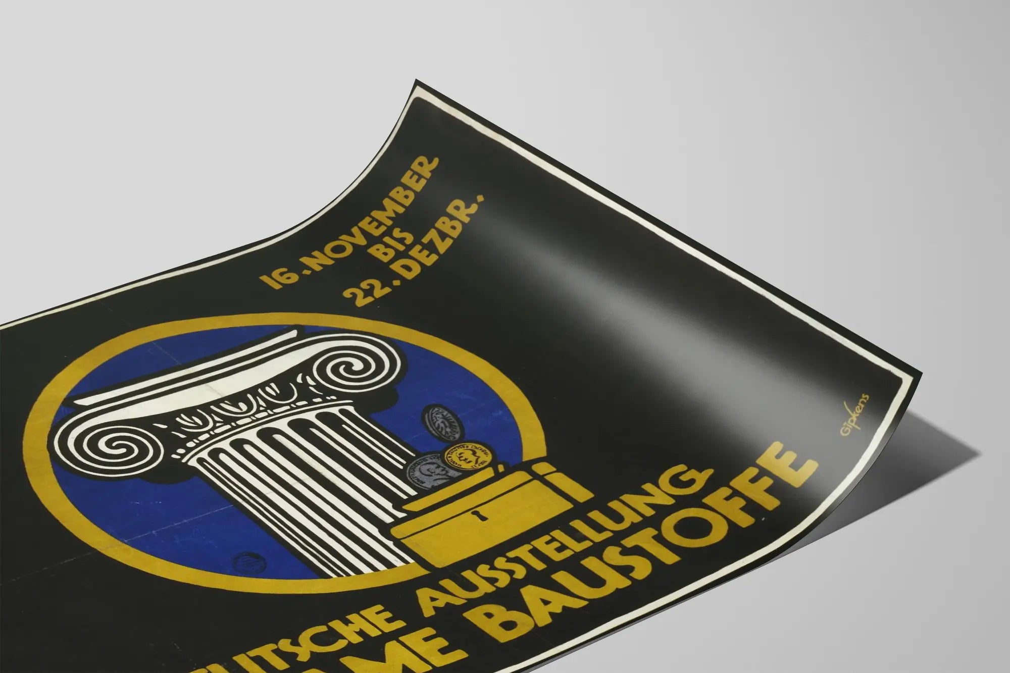 Cette affiche vintage unique met en avant l'Exposition allemande des matériaux économes (« Deutsche Ausstellung Sparsame Baustoffe »), organisée dans les halls d'exposition près du zoo, du 16 novembre au 22 décembre. Le design graphique utilise un style épuré avec des couleurs fortes : un fond noir profond, un cercle bleu entouré d'une bordure dorée, mettant en valeur une colonne architecturale blanche de style ionique, emblématique de la stabilité et de l'ingénierie classique. Au premier plan, une caisse-forte dorée accueillant des pièces de monnaie symbolise l'idée d'économie et de valeur dans le choix des matériaux de construction. Cette affiche allie esthétique rétro et message fonctionnel, idéale pour les amateurs de décorations murales historiques et industrielles. Utiliser cette affiche comme décoration murale confère à votre espace une touche d'authenticité et de style vintage urbain. Elle s'adapte parfaitement à un intérieur moderne ou classique, apportant une atmosphère de sophistication et d'histoire liée aux innovations en construction durable et aux économies de matériaux. Que ce soit en poster ou en reproduction encadrée, ce tableau mural séduira les passionnés d'architecture, d'histoire industrielle et de design des années passées. Le contraste entre le noir profond et les éléments graphiques dorés et blancs crée un impact visuel fort, idéal pour habiller un mur dans un bureau, un salon ou une salle d'exposition. Cette pièce déco véhicule également un message éco-responsable à travers le thème de l'efficacité des matériaux, en accord avec les tendances actuelles de décoration visant à inspirer des modes de vie plus durables. Apportez un caractère unique et un brin d'érudition à votre décoration murale grâce à cette affiche historique rare.