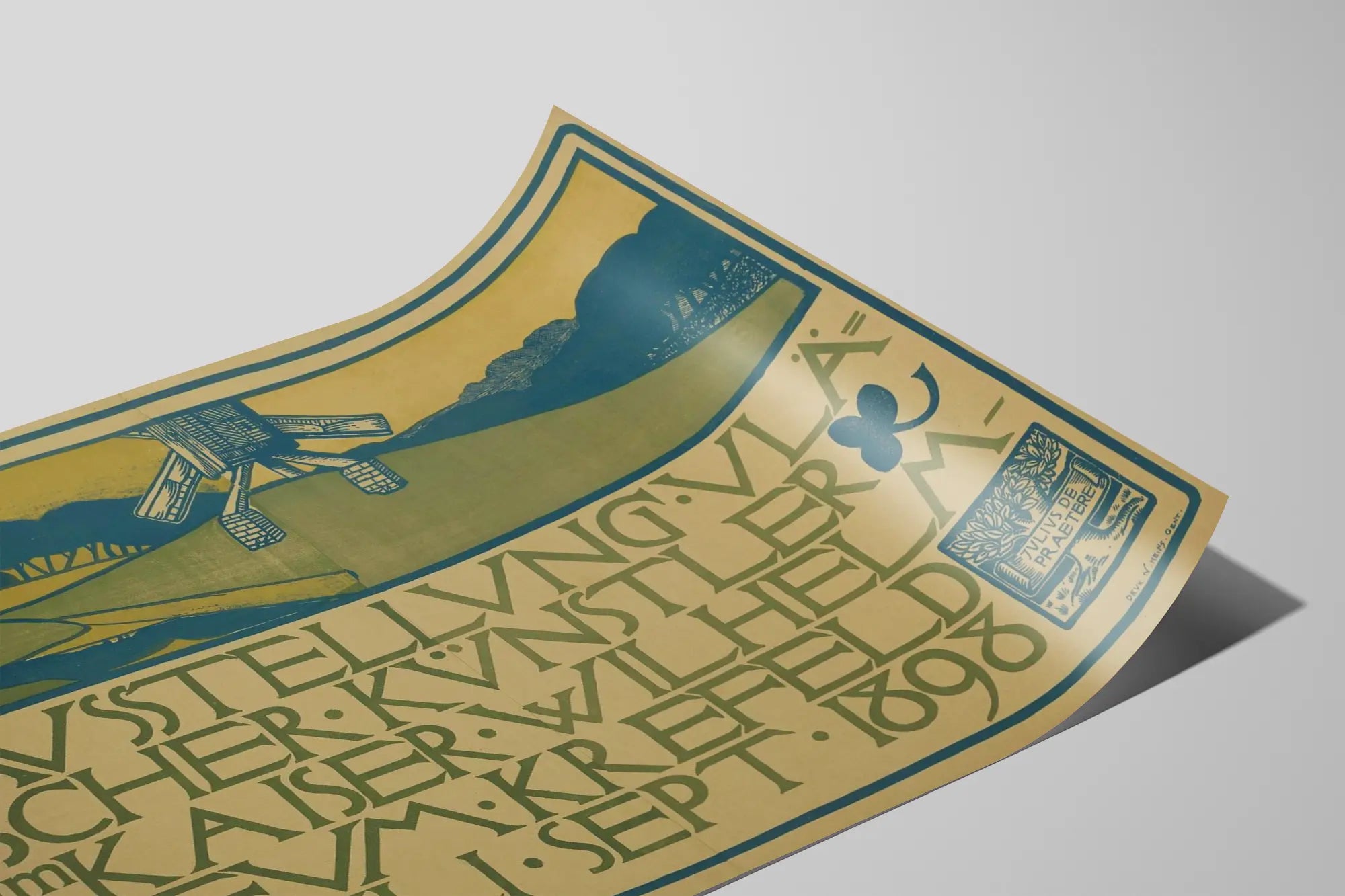 Découvrez cette affiche vintage originale annonçant une exposition d'artistes flamands au Kaiser Wilhelm Museum de Krefeld, datée de juillet-septembre 1898. Ce poster est un exemple unique d'art graphique ancien, mêlant typographie traditionnelle et éléments décoratifs qui évoquent l'ambiance des expositions d'art de la fin du XIXe siècle. La décoration murale proposée par cette affiche allie un design sobre en tons verts et bleus à une composition organisée, mettant en avant le texte central entouré de motifs végétaux et symboliques. La présence d'une église et d'un moulin à vent dans la partie supérieure apporte une touche pittoresque typique des paysages flamands, renforçant ainsi l'identité culturelle de l'événement. Cette pièce est idéale comme affiche ou tableau décoratif pour les amateurs d'art ancien, d'histoire de l'art flamand ou de posters d'expositions historiques. Sa taille et ses couleurs lui permettront de s'intégrer aisément dans un intérieur à la recherche d'une décoration murale authentique et originale. Parfait pour apporter une atmosphère vintage et culturelle à tout espace, ce poster témoigne de la richesse artistique des expositions du XIXe siècle, en valorisant l'art flamand dans un cadre muséal. Ce tableau décoratif trouve sa place chez les collectionneurs, dans des salons ou bureaux où l'on souhaite afficher un goût prononcé pour l'histoire de l'art et les affiches anciennes, offrant une esthétique artistique particulièrement recherchée.