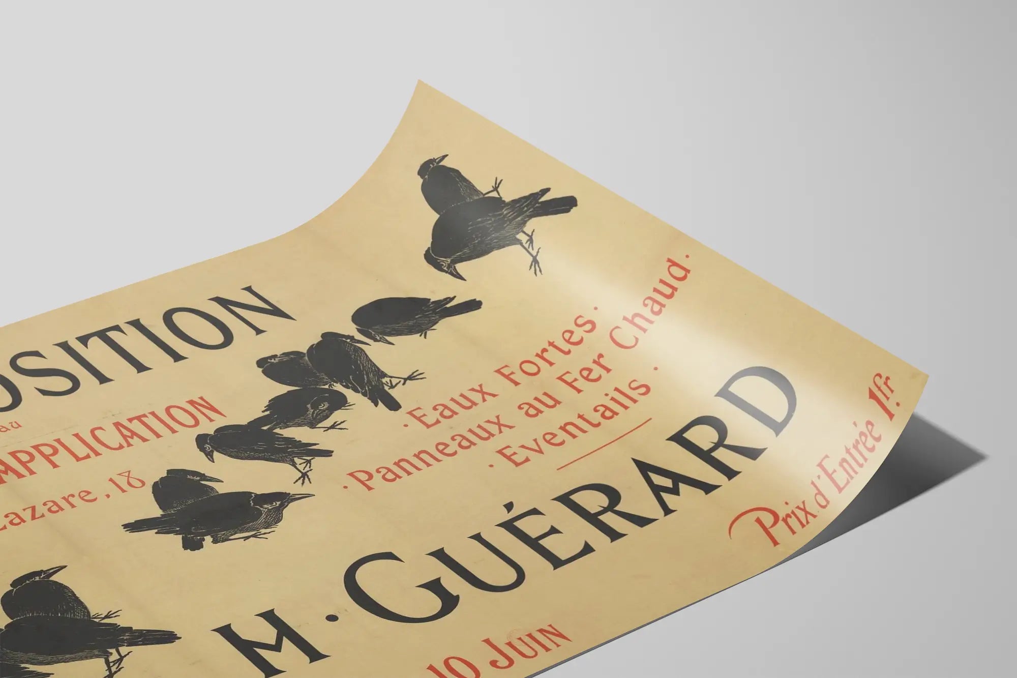 Cette affiche vintage est une pièce unique de décoration murale idéale pour les amateurs d’art graphique et d’histoire culturelle. Elle annonce une exposition tenue au Théâtre d'Application, situé rue Saint-Lazare, du 26 mai au 10 juin. Ce poster met en lumière le travail de M. Guérard, spécialisé dans les eaux-fortes, panneaux au fer chaud ainsi que les éventails, mettant en avant des techniques artistiques traditionnelles. Par son style typographique et sa composition rétro, ce tableau affiche un charme ancien qui apportera une touche d’élégance et d’authenticité à votre intérieur. L’aspect légèrement vieilli du papier, ainsi que les illustrations sombres de corbeaux survolant l’affiche, accentuent cet effet vintage et artistique, parfait pour une décoration murale de caractère. Que vous cherchiez une affiche décorative pour un salon, un bureau ou un espace créatif, ce poster d’exposition apporte une ambiance inspirante et artistique. Il valorise l’art graphique classique tout en offrant une décoration originale, où typographie et illustration s’allient harmonieusement. Ce tableau au style rétro est un choix parfait pour ceux qui aiment associer décoration murale et histoire visuelle, apportant une dimension culturelle notable à la pièce où il est exposé.