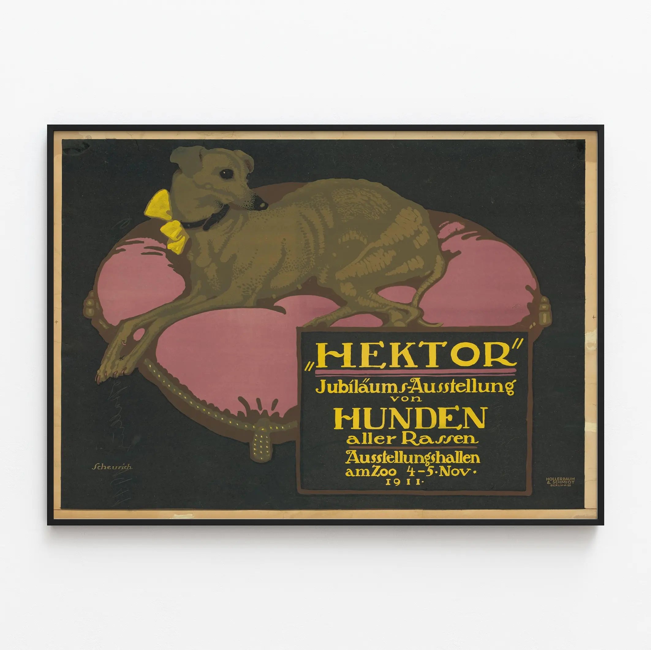 Cette affiche vintage présente une annonce pour une exposition canine appelée "Hektor" dédiée à toutes les races de chiens, qui s'est tenue dans les halls d'exposition du zoo les 4 et 5 novembre 1911. Représentant un chien élégant allongé sur un canapé rose aux formes arrondies, ce poster illustre parfaitement l'ambiance artistique et publicitaire de cette époque. Les couleurs dominantes sont le noir, le rose et le jaune, avec un effet graphique simple mais marqué qui mise sur un contraste fort pour attirer l'attention. L'inscription en allemand occupe une place importante dans la composition, ajoutant un aspect historique et authentique. Ce type d'affiche est idéal pour une décoration murale vintage destinée aux amoureux des chiens, ainsi qu'aux collectionneurs d'affiches anciennes ou d'objets décoratifs ayant une touche rétro. Cette reproduction en poster ou en tableau mural apportera une note nostalgique et élégante à votre intérieur, que ce soit dans un salon, une chambre ou un bureau. La thématique canine et l'aspect artistique en font une pièce de décoration murale originale, pleine de caractère, parfaite pour personnaliser un espace avec un style rétro et animalier. Que vous soyez passionné par les chiens ou amateur d'affiches anciennes, ce poster "Hektor" évoquant l'exposition canine de 1911 sera un choix décoratif unique, apportant chaleur et style à vos murs tout en rappelant un événement historique centenaire.