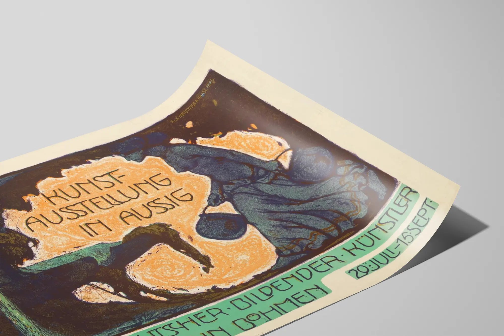Découvrez cette affiche vintage au style Art Nouveau, conçue pour promouvoir une exposition d'art à Aussig, en Bohême. Cette décoration murale ancienne présente une composition harmonieuse mêlant figures féminines stylisées et éléments naturels, typiques du début du XXe siècle. Les tons dominants sont le bleu profond et l'ocre, contrastant avec un fond texturé orange clair où s'inscrit délicatement le titre « Kunst Ausstellung in Aussig ». Cette affiche ancienne est un exemple remarquable du graphisme lié aux expositions artistiques d'époque, associant un message clair et un esthétique singulier. Elle évoque une atmosphère culturelle riche, marquée par l'engagement des artistes allemands de Bohême, comme indiqué dans le texte emblématique en partie basse, où apparaît également la période de l'exposition. En tant qu'élément de décoration murale, ce poster vintage apporte une touche rétro et authentique à votre intérieur, tout en célébrant l'histoire de l'art germanique en Bohême. Son style graphique, marqué par des courbes fluides et une palette harmonieuse, en fait un tableau mural idéal pour les passionnés d'art ancien et les amateurs de design historique. Accrocher ce poster sur un mur blanc ou dans un cadre sobre mettra en valeur ses détails subtils et son ambiance artistique. Cette affiche représente aussi un témoignage visuel unique de la promotion culturelle au début du XXe siècle, ce qui en fait un choix décoratif aussi esthétique qu'évocateur. Parfait pour une décoration studieusement choisie, ce poster vintage s’intègre aussi bien dans un salon, une bibliothèque ou un bureau, offrant un point focal captivant pour toute pièce. Amateurs d'affiches anciennes et de décoration murale, cette pièce remarquable enrichira votre collection en combinant charme historique, graphisme soigné et une dimension culturelle forte.