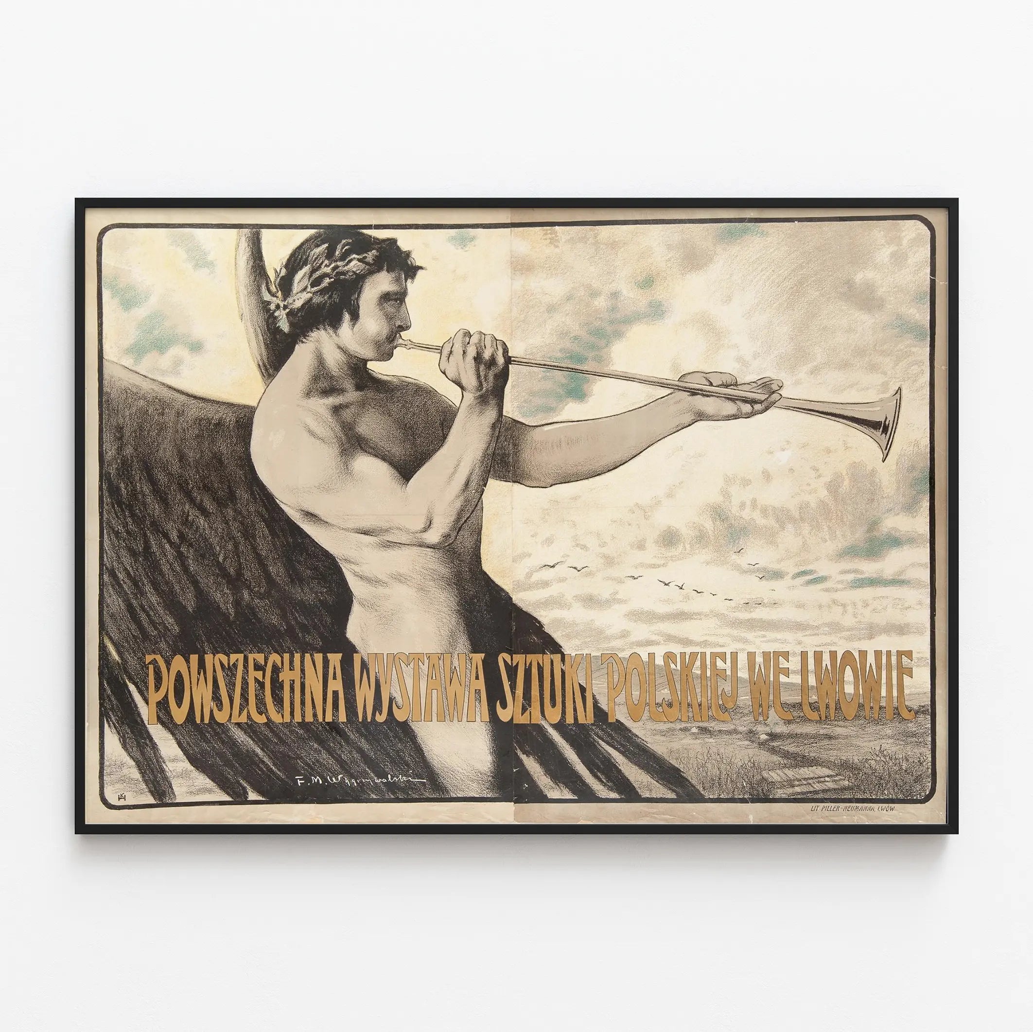 Cette affiche vintage présente une œuvre graphique remarquable mettant en scène un ange puissant soufflant dans une trompette longue, avec des ailes déployées et une couronne de lauriers sur la tête. Le style de l'illustration est minutieusement dessiné en nuances de noir et beige, offrant un rendu à la fois classique et évocateur. Ce poster est une véritable pièce de décoration murale pour les amateurs d'art et d'histoire. Portant l'inscription "Powszechna Wystawa Sztuki Polskiej we Lwowie", cette affiche commémore une exposition d'art polonais à Lwów, ville aujourd'hui connue sous un autre nom. Le design reflète l'esprit de cette manifestation artistique, avec une atmosphère chargée de symbolisme et une invitation à la découverte culturelle. Idéal comme décoration murale, ce poster antique apporte une touche d'élégance et de caractère à tout intérieur, que ce soit dans un bureau, un salon ou une galerie d'art. Sa palette sobre et ses dimensions généreuses permettent de l'intégrer harmonieusement dans des styles variés, du classique au contemporain. Cette affiche est aussi une pièce à collectionner, témoignant d'un moment clé pour l'art et la culture polonaise. Elle séduira tous ceux qui cherchent à enrichir leur décoration avec une affiche murale originale et chargée de sens historique. Offrez-vous ce tableau décoratif unique aux lignes affirmées et au message artistique fort, pour sublimer vos murs avec une note d'authenticité et de raffinement.