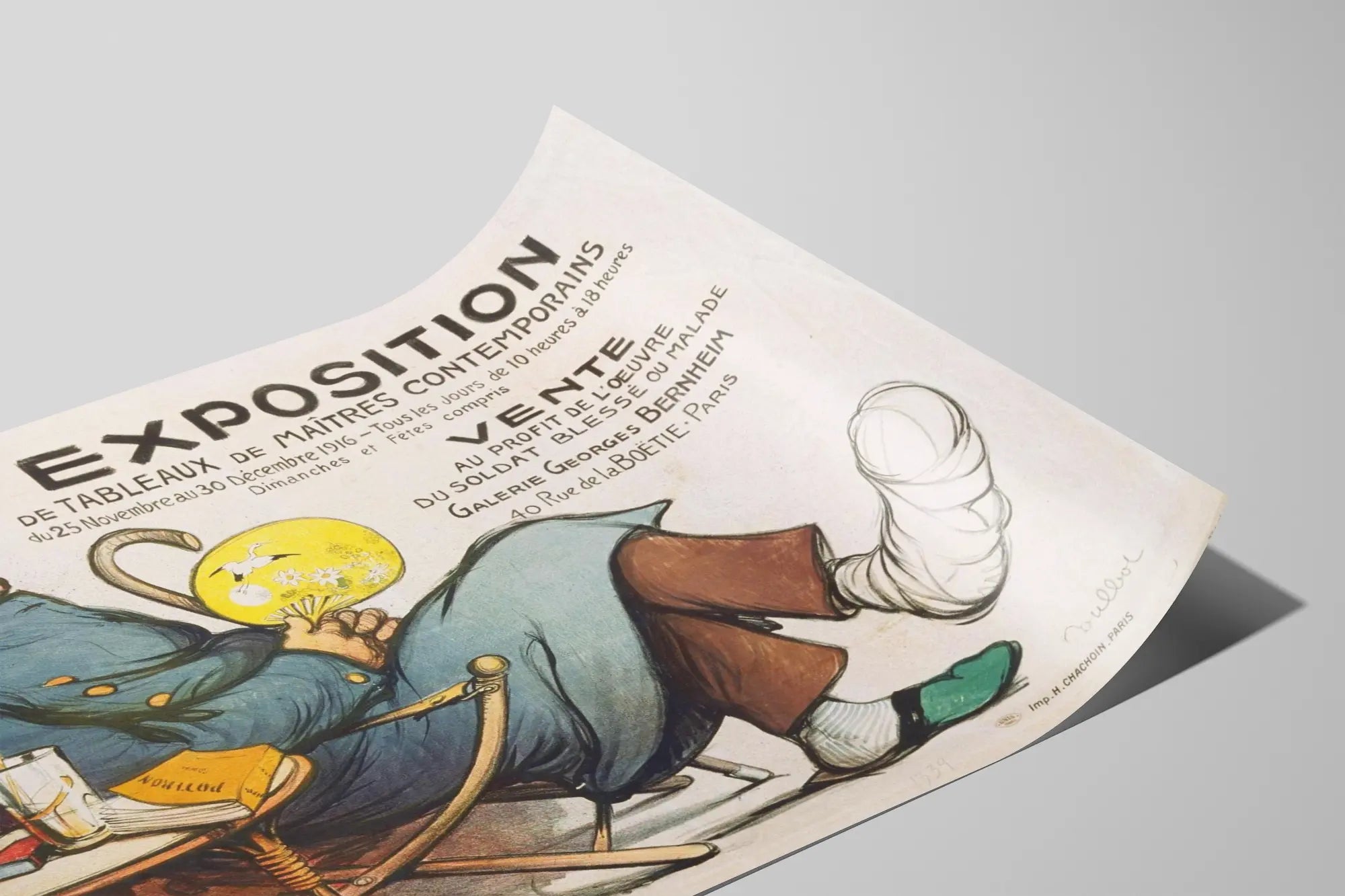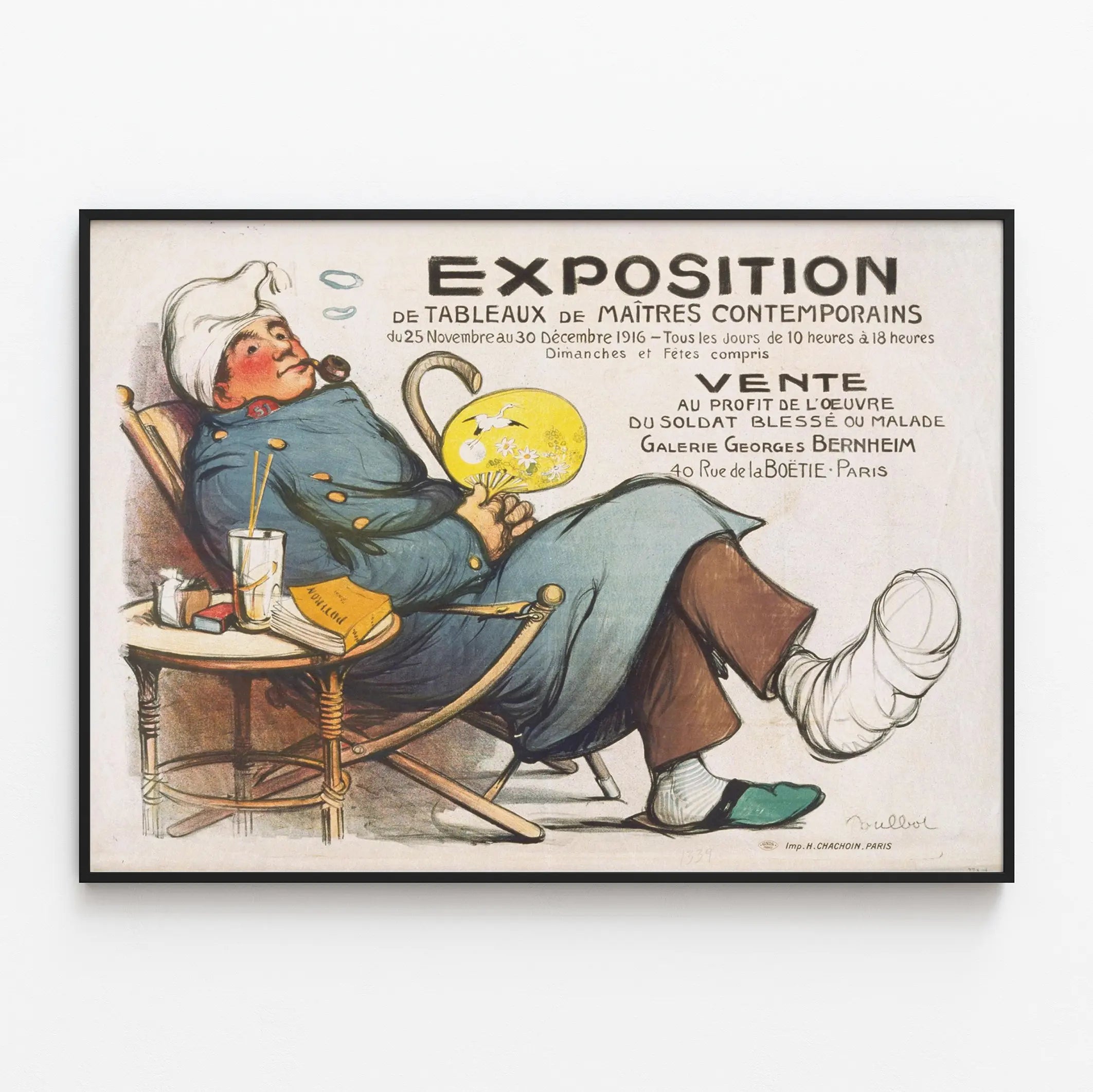 Découvrez cette affiche vintage exceptionnelle qui annonce une exposition de tableaux de maîtres contemporains, organisée à Paris en 1916. Ce poster publicitaire se démarque par son illustration détaillée représentant un soldat blessé, assis dans un fauteuil, symbole de l'œuvre caritative en faveur des soldats blessés ou malades. L'événement se déroulait à la Galerie Georges Bernheim, située au 40 rue de la Boétie, un lieu emblématique pour les amateurs d'art et de décoration murale du début du XXe siècle. Cette affiche d’exposition constitue une pièce de collection unique pour les passionnés d'art et d’histoire, apportant une touche authentique à votre décoration intérieure. Elle illustre parfaitement comment l’art peut être mis au service d’une cause humanitaire, tout en valorisant les talents des maîtres contemporains de l’époque. Le personnage principal, vêtu d’un uniforme bleu avec une jambe en plâtre, offre un aperçu poignant et humain sur le contexte de la Grande Guerre, tout en mettant en avant une esthétique artistique caractéristique du début du XXe siècle. En intégrant un tel poster dans votre décoration murale, vous affirmez un style à la fois vintage et engagé, mêlant histoire et art graphique. Ce type d’affiche peut enrichir un intérieur en lui apportant une ambiance nostalgique et culturelle, parfaite pour un salon, un bureau ou une galerie privée. En plus de son aspect visuel, il porte un message fort de solidarité tout en mettant en lumière la richesse artistique des maîtres contemporains français. Cette décoration murale est idéale pour les amateurs de posters historiques, d’illustrations anciennes ou pour ceux qui recherchent une pièce originale qui stimule la conversation. Elle s’adapte particulièrement bien à des intérieurs décorés dans un style rétro, classique ou industriel, où les affiches murales jouent un rôle central dans la mise en scène de l’espace. Offrez à vos murs une affiche pleine de caractère, mêlant dessin, texte manuscrit et symbolisme, parfaite pour personnaliser votre espace de vie avec une touche d’élégance et d’authenticité. Ce poster est une invitation à redécouvrir une époque passée à travers l’art et la solidarité, faisant de votre décoration un véritable témoignage historique.