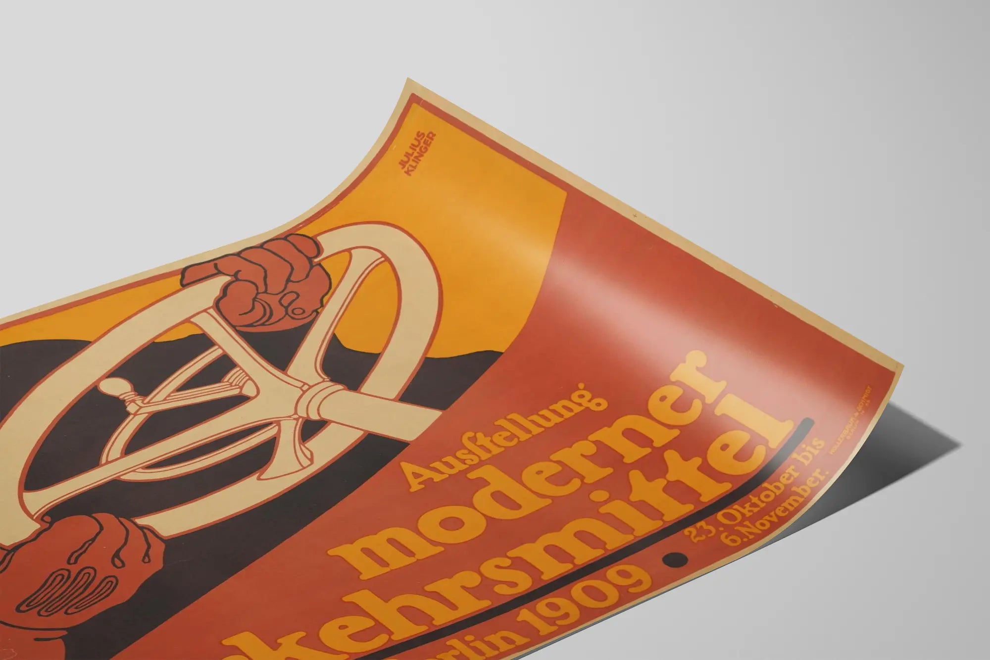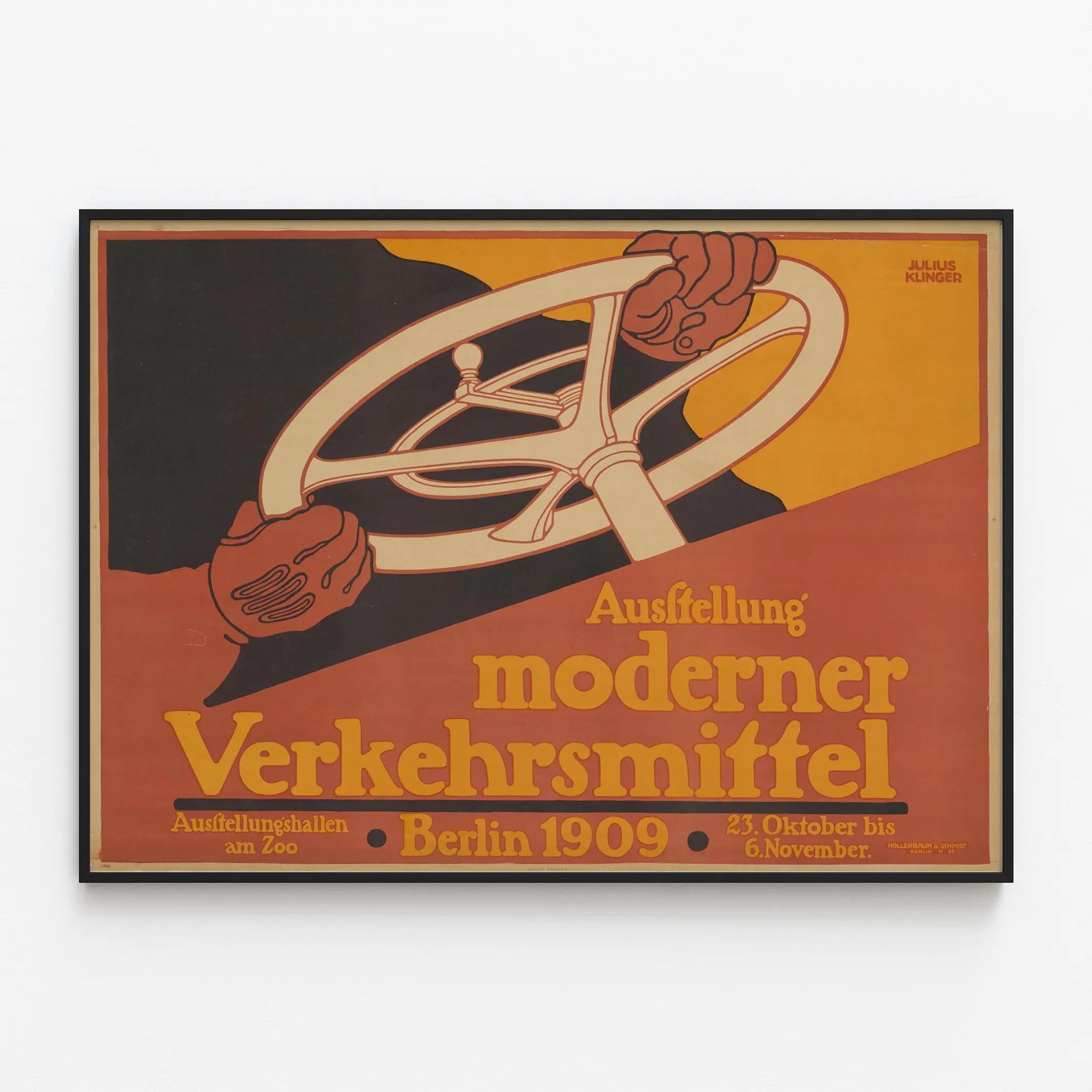 Cette affiche vintage illustre avec dynamisme l'exposition des moyens de transport modernes qui s'est tenue à Berlin en 1909. Conçue par Julius Klinger, cette décoration murale présente un graphisme audacieux et épuré, mettant en avant un volant tenu par deux mains gantées, symbole du progrès mécanique et de la mobilité urbaine de l'époque. Les couleurs chaudes dominent l'affiche avec des teintes d'orange, de noir et de rouge rouille qui créent un contraste saisissant, idéal pour une décoration murale vintage. Ce poster original s'adresse aux amateurs d'art graphique, d'histoire des transports et de design rétro, et s'intègre parfaitement dans un intérieur contemporain cherchant une touche d'authenticité et d'élégance du début du XXe siècle. Parfait en tant qu'affiche décorative dans un salon, un bureau ou un espace dédié à la passion automobile ou aux collections historiques, ce tableau mural est un hommage au développement des moyens de locomotion modernes de cette période. En affichant cette œuvre, vous valorisez non seulement une pièce artistique mais aussi un témoin visuel important de l'évolution des transports, une source d'inspiration pour les passionnés de design et de mobilité. Ce poster d'exposition allie à la fois caractère historique et design graphique audacieux, ajoutant une véritable valeur esthétique à votre décoration d'intérieur.