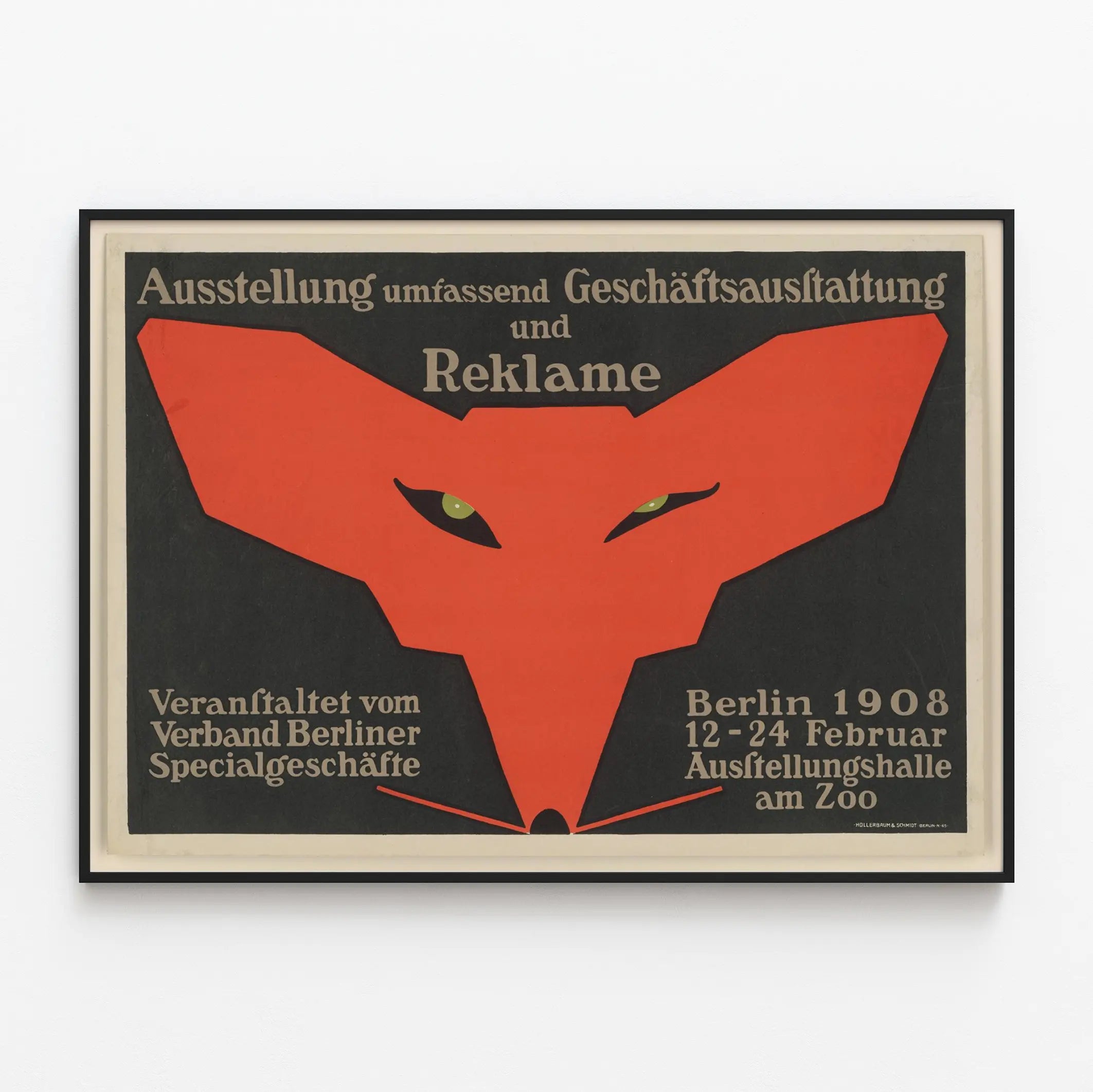 Cette affiche vintage annonce une exposition dédiée à l'aménagement commercial et à la publicité, qui s'est tenue à Berlin en 1908. Elle se caractérise par un graphisme fort et symbolique : un renard stylisé en rouge vif sur un fond noir, symbolisant sans doute la ruse ou l'ingéniosité dans le domaine de la publicité et du commerce. Le texte en allemand mentionne l'organisation de l'événement par l'association des boutiques spécialisées de Berlin, une indication historique précieuse pour les amateurs de décoration murale au style rétro. Ce poster, avec ses couleurs contrastées et son design épuré, constitue un élément de décoration murale unique, qui attire l'œil et suscite la curiosité. Il s'intègre parfaitement dans un intérieur moderne ou vintage, apportant un accent graphique et culturel. Cette affiche, qui dépasse le simple statut d'objet publicitaire, peut aussi être appréciée comme une œuvre d'art graphique historique. Par sa taille, son style typographique et son composition, ce poster vintage se pose en pièce maîtresse de toute collection de décoration murale. Elle conviendra particulièrement aux passionnés d'art graphique et d'histoire de la publicité, ainsi qu'aux amateurs de posters originaux pour décorer un bureau, une salle d'exposition ou un espace commercial. En ajoutant ce tableau mural, vous offrez à votre pièce une touche d'authenticité et une ambiance inspirée par le design allemand du début du XXe siècle. Cette affiche est donc une excellente option pour enrichir une décoration murale avec un objet rare, au message fort et au style graphique distinctif.