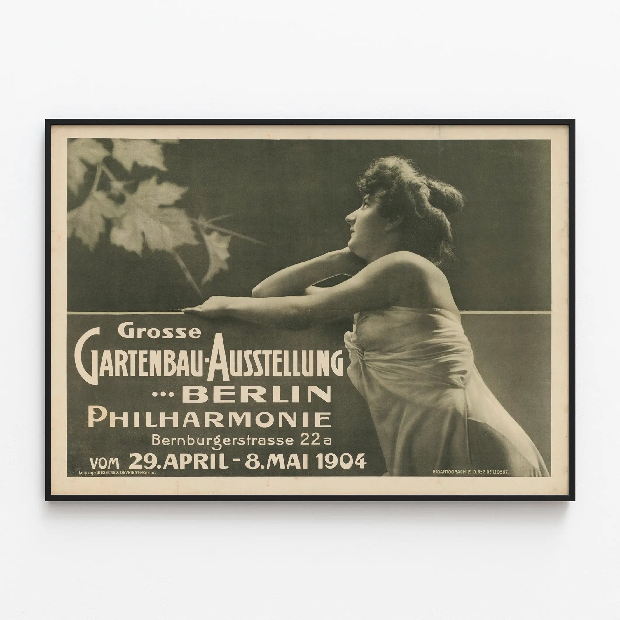 Découvrez cette affiche vintage exceptionnelle représentant la "Grosse Gartenbau Ausstellung Berlin" qui a eu lieu à la Philharmonie de Berlin, du 29 avril au 8 mai 1904. Cette décoration murale en style rétro illustre une femme élégamment drapée, évoquant une atmosphère douce et nostalgique, parfaitement adaptée aux amateurs d'art ancien et d'expositions horticoles historiques. Ce poster est une invitation au voyage dans le temps, capturant l'essence d'un événement culturel majeur du début du XXe siècle dédié au jardinage et à l'horticulture. Ce tableau mural, riche en détails artistiques, est un choix idéal pour embellir un intérieur avec une touche d'authenticité et d'histoire. Son design monochrome et sa typographie ancienne en font une affiche décorative distinctive, parfaite pour une collection d'affiches vintage ou pour créer une ambiance artistique et élégante dans n'importe quelle pièce. Apportez une pièce unique de décoration murale avec ce poster historique, symbole de l'art graphique et de la tradition horticole berlinoise.