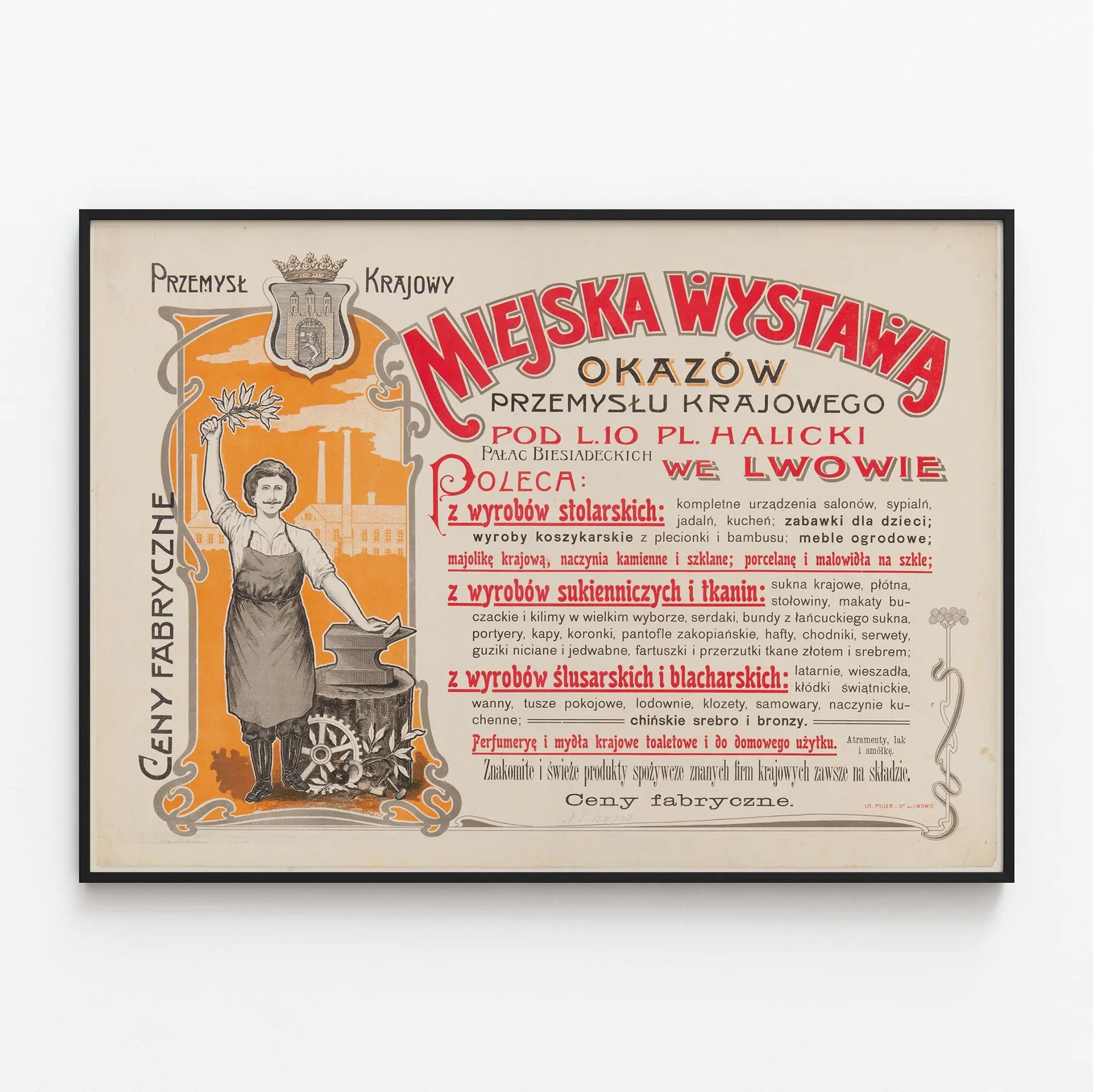 Cette affiche vintage est une pièce unique de décoration murale qui célèbre l'industrie locale, intitulée « Miejska Wystawa Okazów Przemysłu Krajowego ». Imprimée en couleurs vives, principalement en rouge et orange, elle présente un ouvrier en tablier devant un enclume et une roue dentée, symbolisant le travail industriel et artisanal. La composition graphique et typographique, mêlant des caractères audacieux et finement dessinés, attire le regard tout en racontant une histoire industrielle et culturelle. Ce poster met en avant divers produits artisanaux et industriels exposés, allant des meubles en bois, porcelaines, tissus, jusqu'aux produits métallurgiques et aux articles de toilette. De par son style et ses éléments visuels, cette affiche est une illustration parfaite à intégrer dans un intérieur au design rétro ou industriel, apportant une touche d'authenticité et de caractère. Parfaite comme décoration murale dans un bureau, un atelier ou une salle à manger, elle contribue à créer une ambiance inspirée d'un passé industriel riche et dynamique. Son esthétique vintage en fait un choix de prédilection pour les amateurs de posters anciens et les passionnés de design historique. Ce tableau mural est aussi un excellent cadeau pour les collectionneurs de décoration murale industrielle ou ceux qui cherchent à personnaliser leur espace avec des affiches au fort impact visuel. En choisissant cette affiche, vous ajoutez une pièce artistique marquante qui célèbre la diversité et la richesse des métiers manufacturiers et artisanaux d'antan. Cette pièce est également idéale pour les projets de décoration thématique, contribuant à transmettre un message culturel fort à travers son graphisme et son contenu textuel.