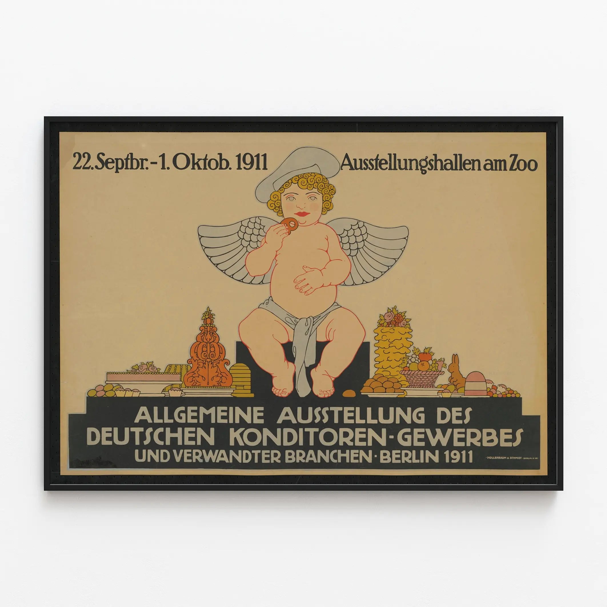 Découvrez cette affiche vintage illustrant l'Allgemeine Ausstellung des Deutschen Konditor-Gewerbes, une grande exposition allemande dédiée à l'art de la pâtisserie et aux métiers associés, qui s'est tenue à Berlin en 1911. Cette affiche de style rétro met en scène un ange gourmand au centre, dégustant une pâtisserie, entouré de diverses douceurs et créations sucrées. Le graphisme épuré et les couleurs sobres en font une pièce de décoration murale idéale pour les amateurs d'histoire et de gastronomie, mais aussi pour ceux qui recherchent une touche d'élégance classique dans leur intérieur. Ce poster ancien, avec son texte en allemand, rappelle un événement culturel et gastronomique important du début du XXe siècle, valorisant les métiers de la confiserie et de la pâtisserie artisanale. Parfait pour être encadré et exposé dans une cuisine, un salon ou une boutique dédiée à la pâtisserie, cette décoration murale apporte un charme authentique et une atmosphère vintage grâce à ses éléments graphiques uniques et son esthétique d'époque. Apportez une ambiance historique et gourmande à vos murs avec cette affiche qui célèbre l'art sucré et l'excellence artisanale allemande.