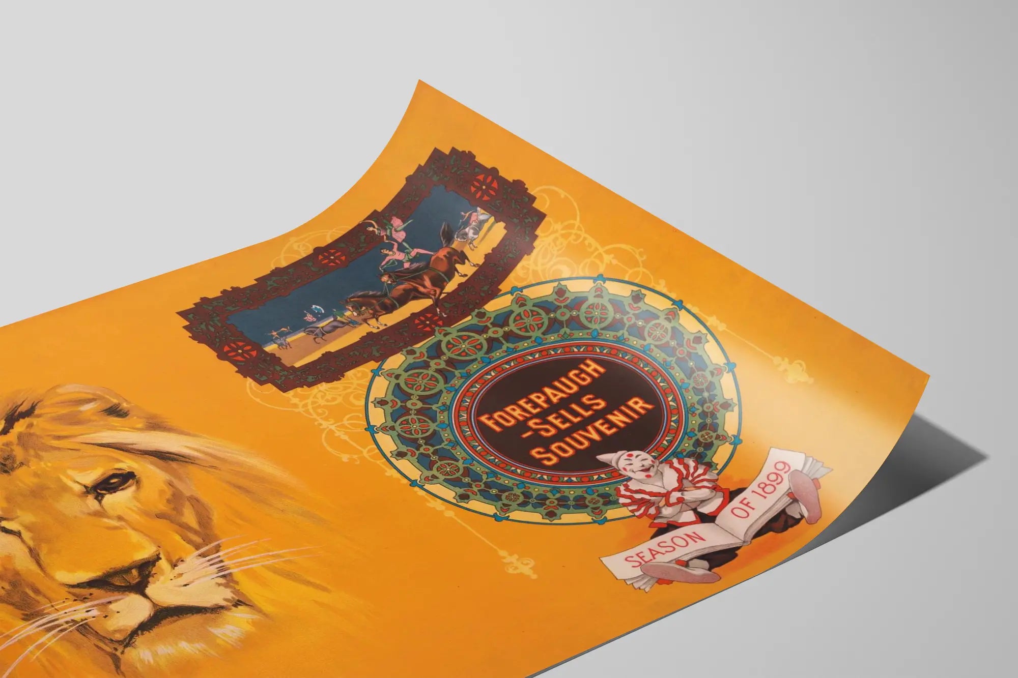 Découvrez cette affiche vintage exceptionnelle qui immerge dans l'ambiance fascinante de la saison 1899 du spectacle Forepaugh Sells Souvenir. Cette décoration murale au style rétro met en avant un portrait saisissant d'un lion au regard profond, symbolisant la force et la majesté, éléments emblématiques des spectacles du cirque et de la ménagerie d'autrefois. Sur fond orange lumineux, cette affiche attire immédiatement le regard par son contraste intense et ses couleurs chaleureuses. La composition graphique comprend aussi un encadré décoratif au style art nouveau où sont représentés des acrobates équestres en pleine performance, ajoutant une touche dynamique et festive à l'ensemble. En bas, un clown souriant et articulé complète l'illustration, renforçant l'esprit de divertissement et d'amusement propre à cette époque. Cette affiche se présente ainsi comme un véritable poster de collection à la fois décoratif et historique, idéale pour une décoration murale vintage dans un salon, une salle de spectacle ou un espace dédié à l'univers du cirque et des arts du spectacle. Que ce soit encadrée ou simplement suspendue, elle apportera une touche d'authenticité et de nostalgie. Parfait pour les amateurs de décoration murale qui recherchent un tableau au style ancien, cette affiche vintage enrichira votre intérieur en racontant une histoire visuelle riche. Sa palette de couleurs chaudes et son graphisme soigné en font un élément décoratif remarquable, capable d'attirer l'attention et de susciter la curiosité. Affiche originale imprimée sur papier, ce poster est un hommage au spectacle Forepaugh, un nom qui évoque le monde du cirque à la fin du XIXe siècle. Sa présentation soignée et ses motifs élégants conviennent parfaitement à une décoration murale stylée, alliant art et histoire." Apportez une touche d'élégance ancienne et un soupçon de magie circassienne à vos murs avec ce poster unique "Forepaugh Sells Souvenir Saison 1899", un choix décoratif aussi artistique qu'authentique.