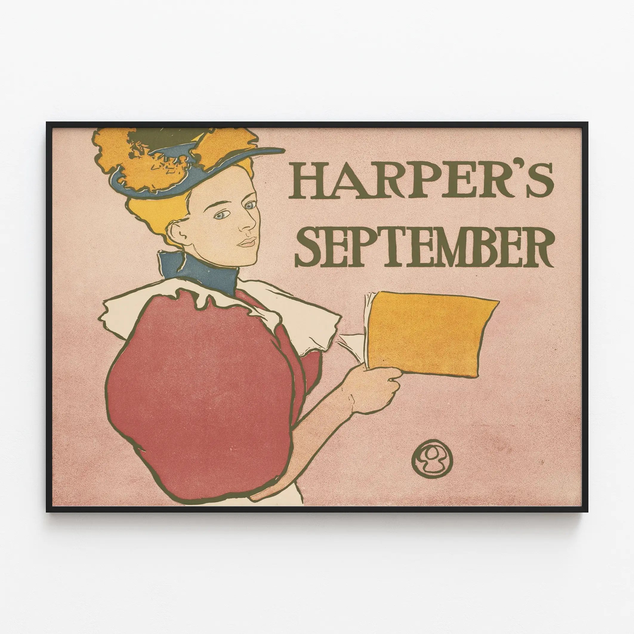 Cette affiche vintage Harper's September incarne parfaitement le style artistique du début du XXe siècle avec son illustration au trait fin et ses couleurs douces. La composition met en scène une femme élégante vêtue d'une robe à manches bouffantes rouges et d'un col blanc. Sa coiffe bleue ornée de fleurs jaunes et ses cheveux blonds lui confèrent un charme raffiné, typique de cette époque. Elle tient un livre ou un livret couleur ocre, ajoutant une touche narrative à cette décoration murale. Le fond poudré rose souligne la délicatesse de l'ensemble, tandis que le titre "Harper's September" en lettres majuscules, bien lisibles et disposées sur la partie droite, renforce l'aspect graphique de ce poster. Cette affiche se présente comme une pièce de décoration murale idéale pour les amateurs d'art graphique vintage, apportant une atmosphère nostalgique et élégante à tout espace. Parfaite pour un salon, une bibliothèque ou un bureau, elle s'intègre aussi bien dans un décor contemporain que classique grâce à ses tonalités sobres et à son illustration stylisée. Ce poster est un bel exemple d’affiche publicitaire ancienne qui met en valeur l’esthétique et l’élégance féminine à travers un dessin simple mais expressif. En choisissant cette décoration murale, vous investissez dans une pièce intemporelle qui séduit par son graphisme travaillé et son ambiance douce, idéale pour une mise en valeur subtile de vos murs.