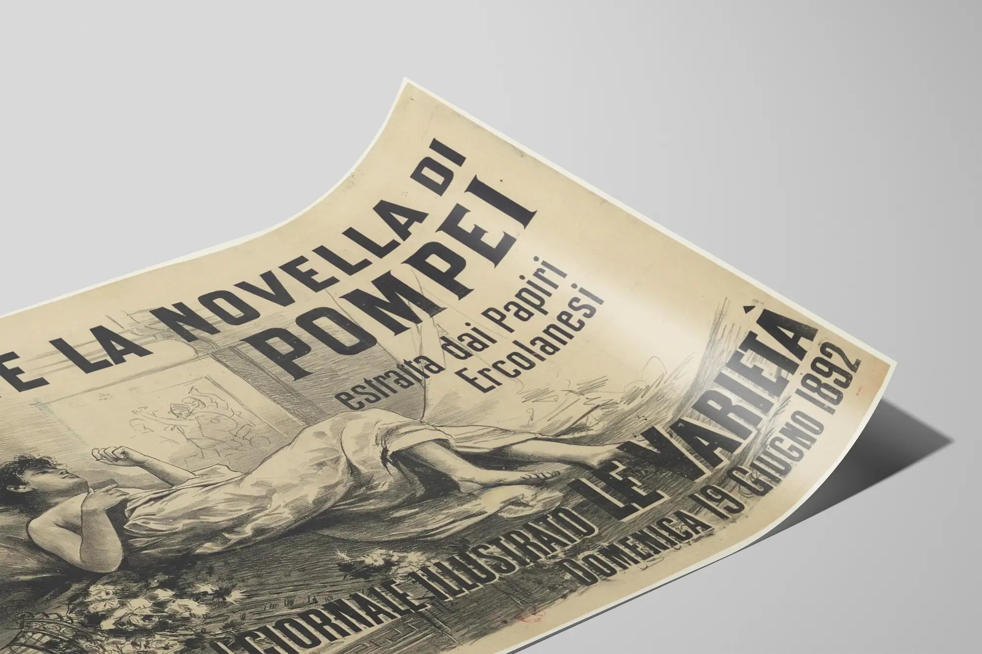 Cette affiche vintage italienne, intitulée « Leggete la Novella di Pompei », évoque avec douceur et mystère une scène d’inspiration classique, mettant en avant une jeune femme allongée et drapée dans un tissu léger, en posture de lecture ou de rêverie, probablement dans un intérieur raffiné. Détail important de la composition, le texte en italien offre une invitation à lire une nouvelle extraite des Papyrus d'Herculanum, publié dans le journal illustré "Le Varietà" le dimanche 19 juin 1892. Ce poster ancien mêle ainsi une esthétique artistique de la fin du XIXe siècle à un contenu littéraire et historique, faisant référence aux célèbres papyrus d’Herculanum, ces précieux manuscrits antiques découverts dans les fouilles de cette ancienne cité romaine.