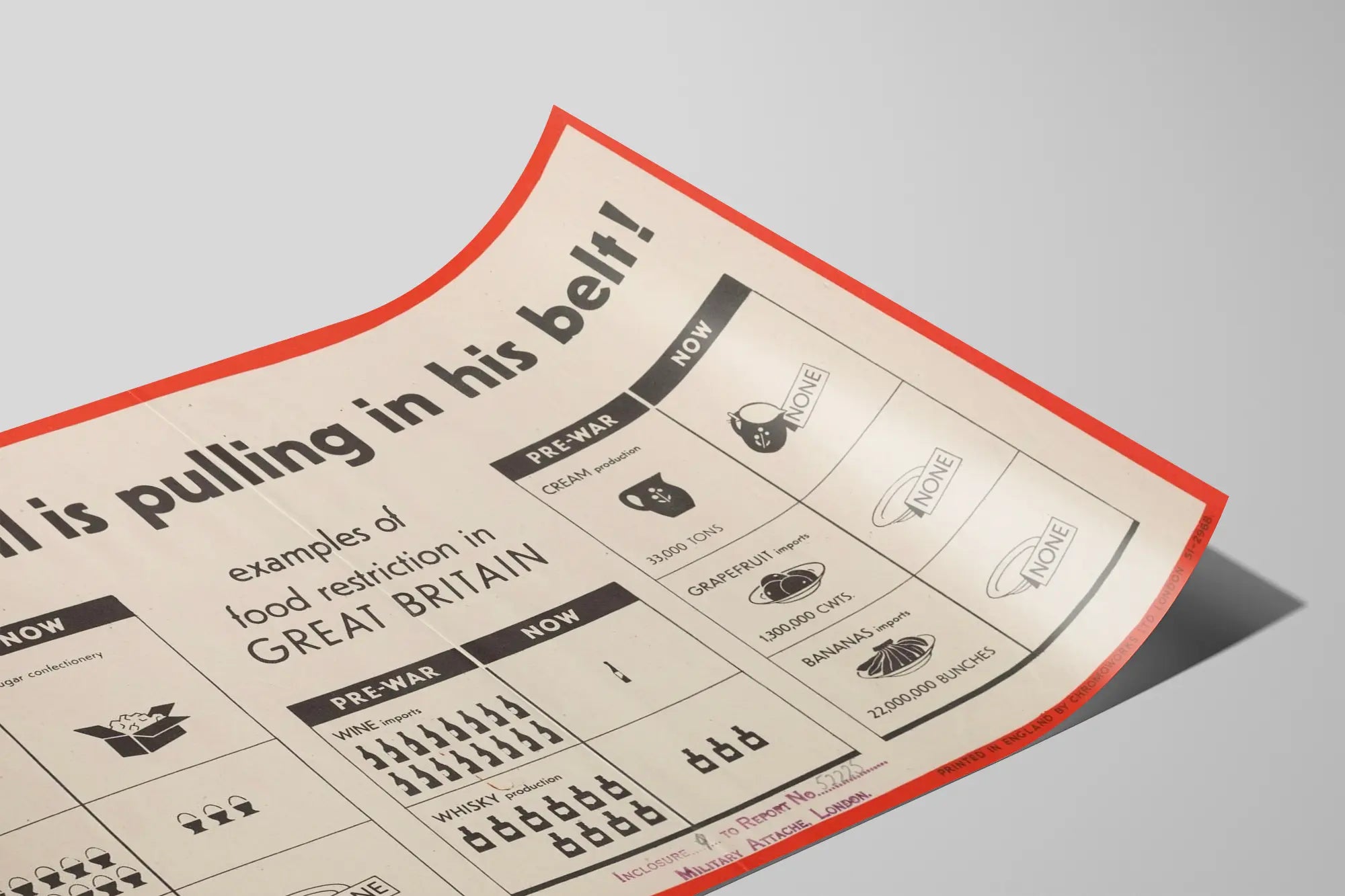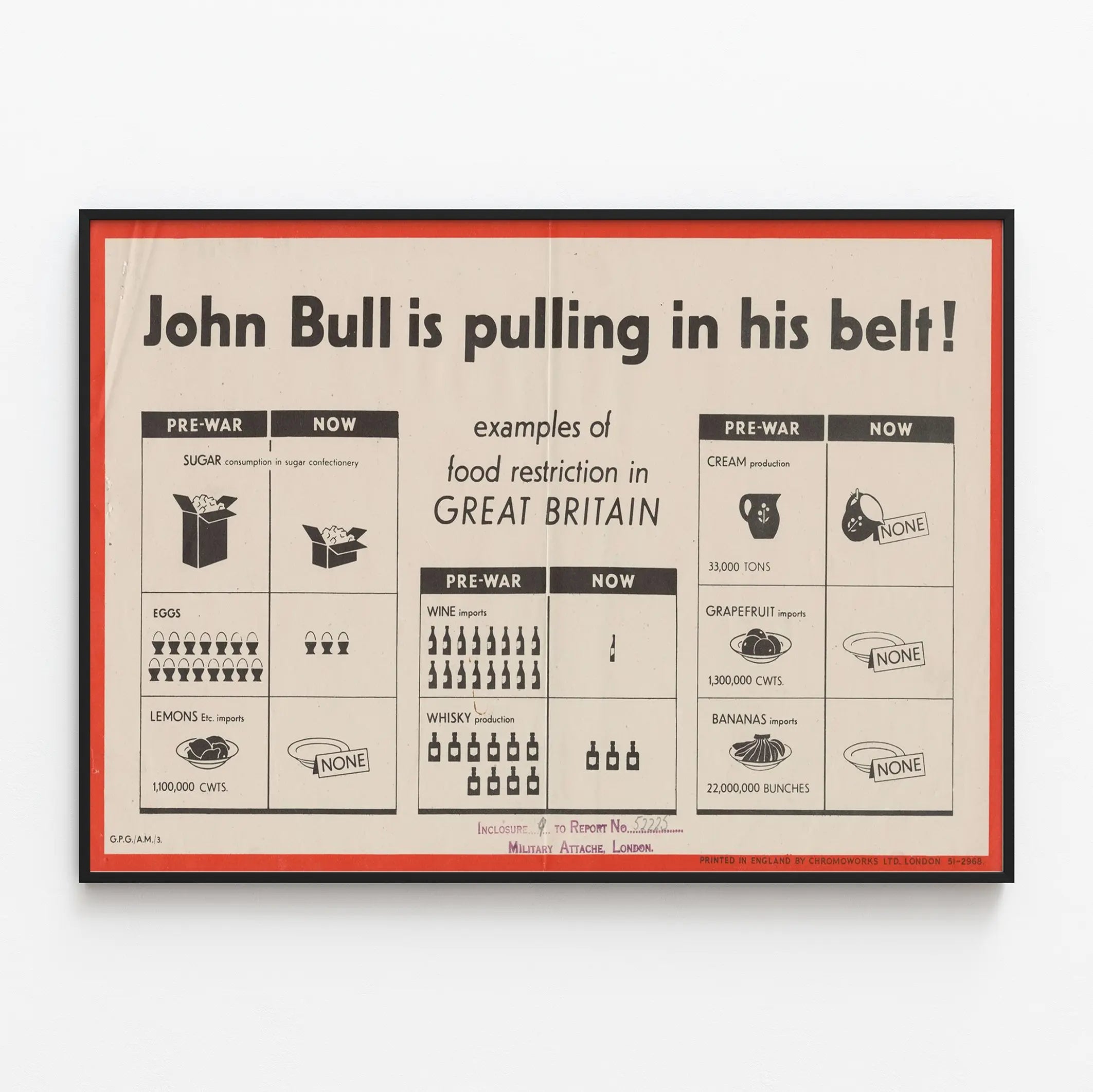 Cette affiche vintage illustre les restrictions alimentaires en Grande-Bretagne avec la représentation emblématique de John Bull resserrant sa ceinture, symbole visuel fort de rationnement. Ce poster présente une comparaison graphique entre la consommation et l'importation de plusieurs denrées alimentaires avant-guerre et pendant la guerre. On y voit notamment la baisse significative de la consommation de sucre, des œufs, des citrons ainsi que des importations de vin, whisky, crème, pamplemousse et bananes, souvent indiquées comme inexistantes dans la période actuelle. Cette décoration murale évoque un contexte historique de rationnement et de pénurie, idéal pour les amateurs d'affiches rétro ou d'éléments décoratifs chargés d'histoire. Son design épuré en noir et blanc avec encadrement rouge accentue son aspect informatif et didactique, donnant à cette affiche un charme authentique et une grande valeur décorative pour un intérieur souhaitant mêler esthétisme et mémoire visuelle. Parfaite pour une décoration murale originale, cette affiche s'intègre harmonieusement dans un environnement vintage, un bureau ou une bibliothèque, apportant une touche d'histoire visuelle autour des restrictions alimentaires britanniques.