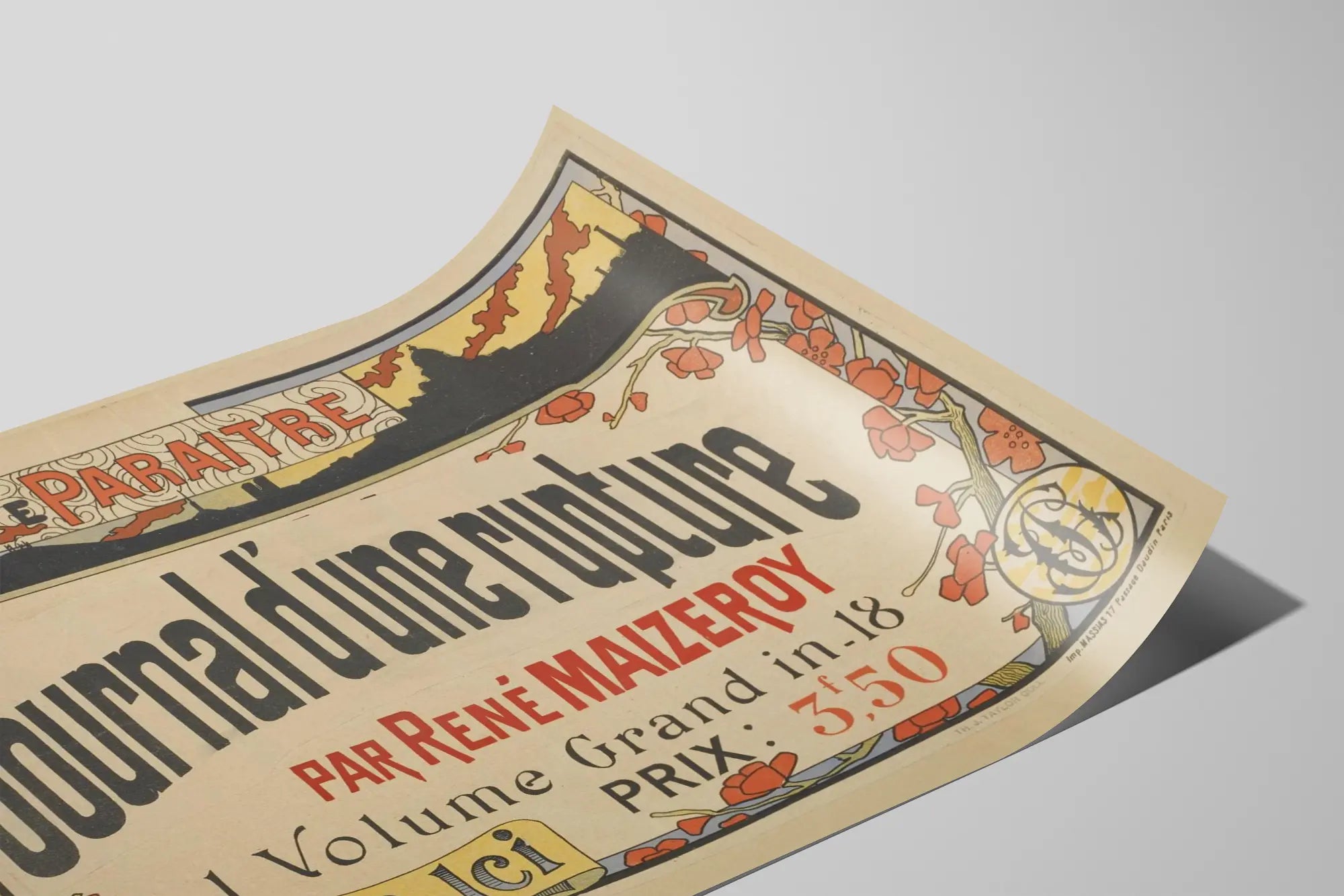 Découvrez cette affiche vintage intitulée « Journal d'une rupture » par René Maizeroy, une pièce unique de décoration murale qui apportera un charme rétro à votre intérieur. Ce poster publicitaire ancien se distingue par son style art nouveau avec des éléments décoratifs tels que des fleurs stylisées et un paysage urbain en silhouette sur fond jaune et rouge. Le graphisme accrocheur mêle typographies en lettres capitales noires et rouges pour le titre et le nom de l'auteur, créant un contraste visuel fort et une ambiance nostalgique. Parfait pour sublimer un salon, un bureau ou une bibliothèque, ce tableau imprimé évoque une époque où l'affiche publicitaire était un art à part entière. Les détails floraux et ornementaux sur les pourtours encadrent élégamment le texte central, transformant ce poster en véritable objet de décoration murale artistique. Ce type d'affiche est idéal pour les amateurs de vintage et de graphisme ancien qui souhaitent enrichir leur collection ou personnaliser leur espace de vie avec une touche historique et esthétique. En intégrant ce tableau mural, vous investissez dans une pièce unique alliant histoire et décoration, qui peut parfaitement s'associer à d'autres éléments d'inspiration rétro ou contemporaine pour un rendu harmonieux. Apportez à vos murs une atmosphère authentique et pleine de caractère grâce à ce poster vintage « Journal d'une rupture », une décoration murale qui interpelle par son message autant que par son style graphique singulier.