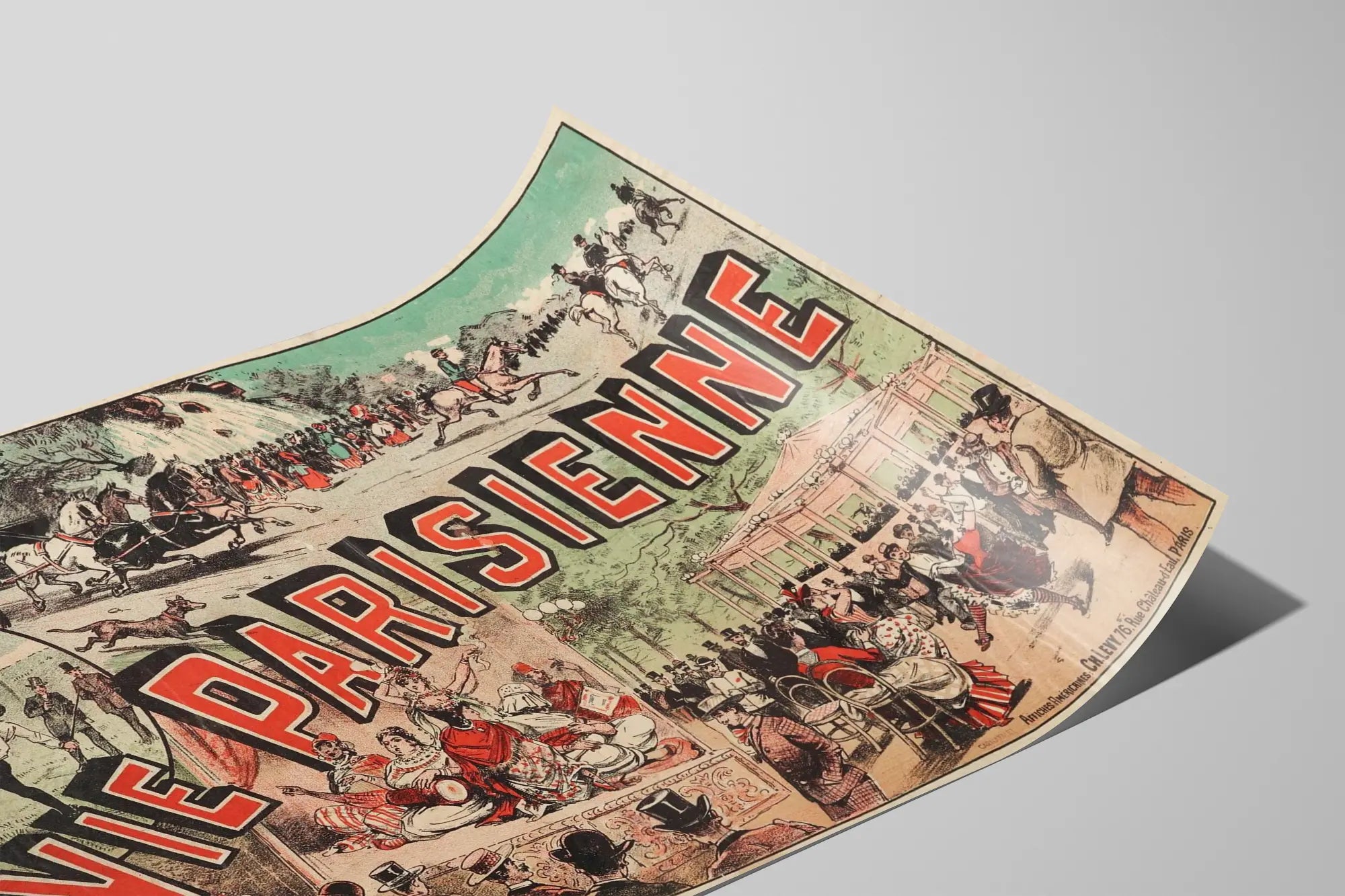 Cette affiche vintage intitulée « La Vie Parisienne » capture un instant animé de la vie parisienne, idéale pour une décoration murale pleine de charme et d'histoire. Le poster évoque avec finesse une atmosphère festive dans un parc ou jardin public où se déroulent diverses activités de loisirs typiques de la belle époque. Plusieurs vignettes illustrent des scènes variées : une course hippique avec des cavaliers en tenue élégante, une promenade en calèche tirée par quatre chevaux, un combat d'escrime stylisé ainsi qu’un spectacle avec des danseuses sur scène. Le dessin met en scène une foule d’élégants badauds aux chapeaux haut de forme et canotiers, mêlant hommes, femmes et enfants dans un décor bucolique ponctué d’arbres et de structures comme une rotonde accueillant un orchestre. Les couleurs dominantes sont des tons pastel verts et bleus contrastés par le rouge vif des costumes et du titre en lettres capitales qui tranche sur le fond. Ce tableau mural imprimé sur papier s'intègre parfaitement dans une ambiance rétro ou un intérieur au style parisien classique. Il permet d’ajouter une touche visuelle à la fois artistique et nostalgique à son espace de vie, bureau ou salle d’attente. Ce poster décoratif évoque l’élégance et la diversité culturelle des loisirs parisiens, parfait pour les amateurs d’histoire, de théâtre, de chevaux ou de danse traditionnelle. Il s’adapte pour une décoration murale vintage en recherche d’authenticité et d’ambiance chaleureuse. Ce type d'affiche est un classique intemporel qui révèle la vie animée et sophistiquée de Paris à travers des illustrations stylisées et dynamiques. Installer ce poster sur un mur contribue à créer un espace décoratif riche en détails et en évocations historiques, idéal pour renouveler une pièce avec un accent classique et coloré.