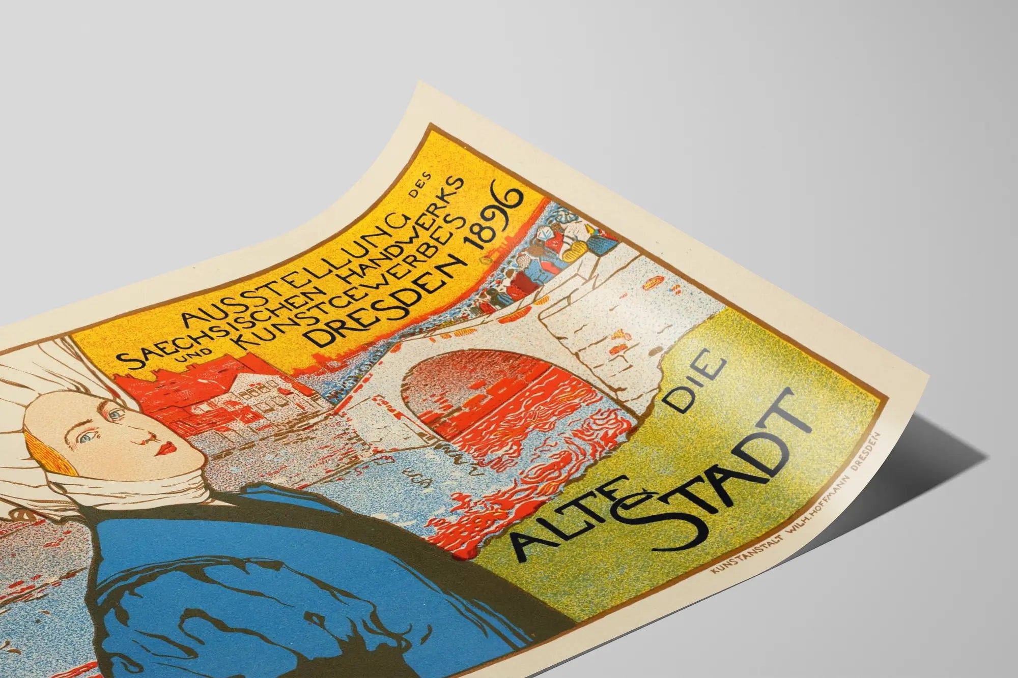 Cette affiche vintage intitulée "La Vieille Ville" capture avec charme l'esprit d'une exposition artisanale et artistique tenue à Dresde en 1896. La composition graphique met en scène une scène pittoresque où une femme en costume traditionnel attire le regard, devant un fond illustrant un pont ancien et des bâtiments historiques au bord d'une rivière. L'utilisation de couleurs vives et contrastées — jaune, rouge, bleu et vert — dynamise cette décoration murale, qui mêle art et tradition.