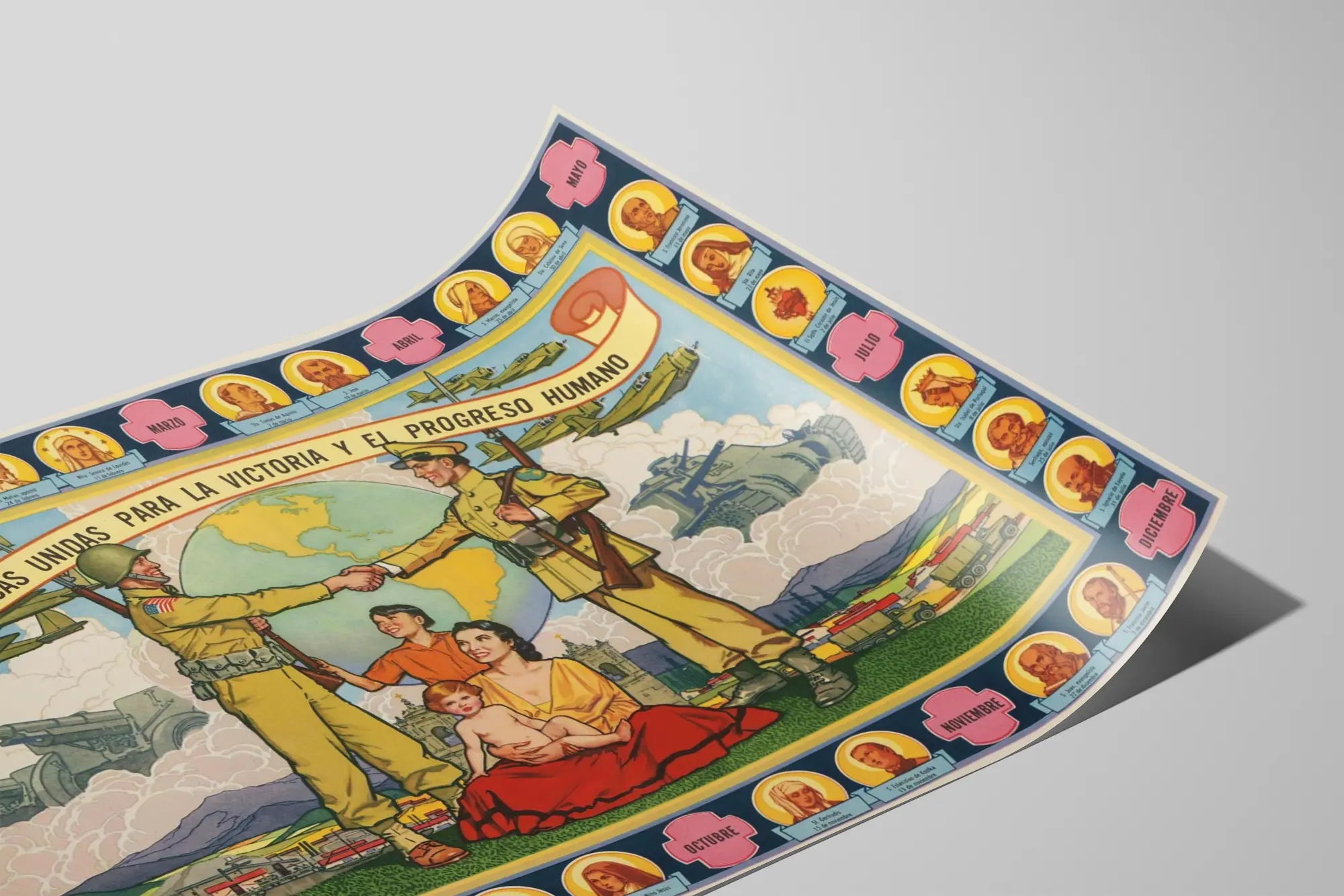 Cette affiche vintage intitulée « Las Américas Unidas para la Victoria y el Progreso Humano » est une décoration murale chargée d'histoire et de symbolisme. Elle met en scène deux soldats en tenue, se serrant la main devant une grande représentation du continent américain, mettant en lumière l'unité des Amériques dans un contexte de victoire et de progrès humain. La scène centrale inclut également une femme assise avec deux enfants, symbolisant peut-être l'espoir et la paix pour les générations futures.