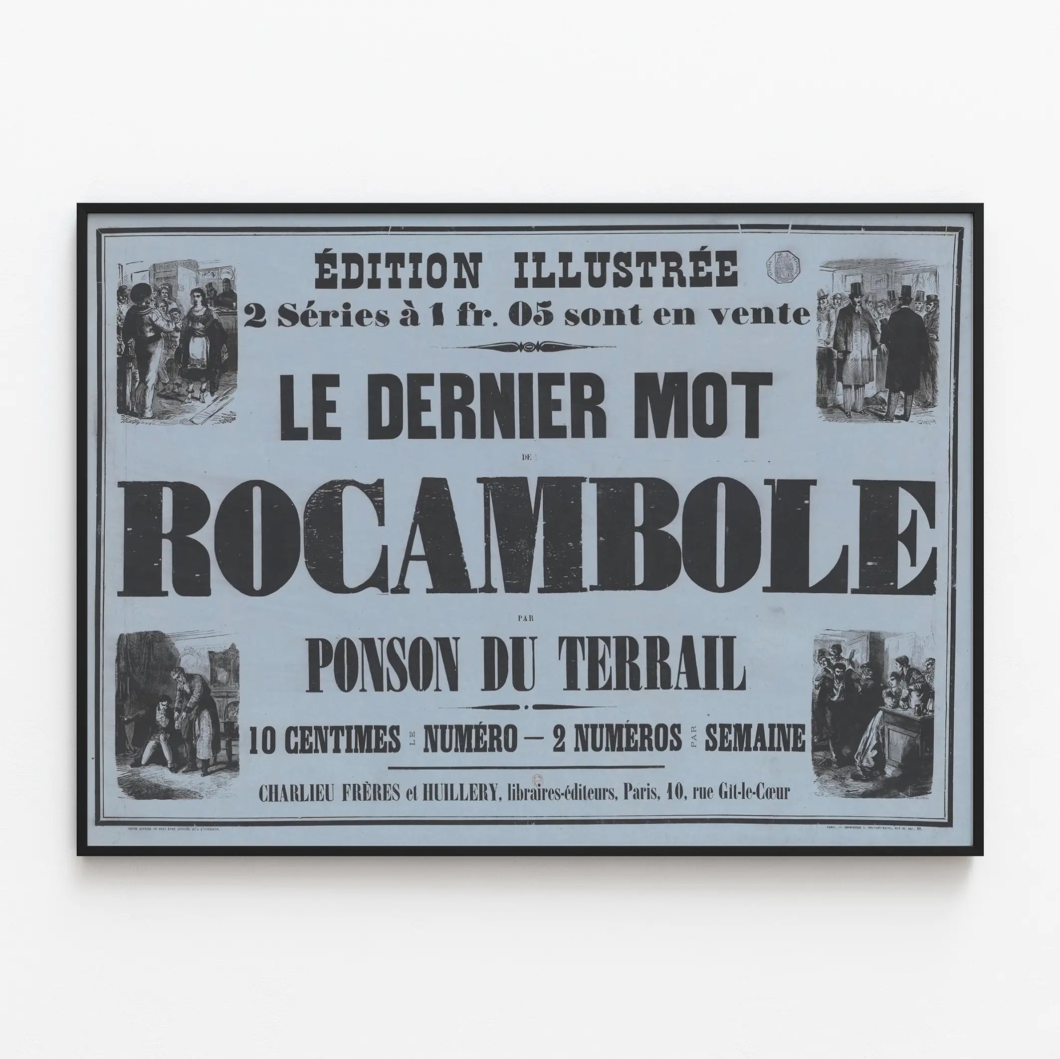 Cette affiche vintage "Le Dernier Mot de Rocambole" de Ponson du Terrail apporte une touche d'histoire littéraire et un charme rétro à votre décoration murale. Imprimée en noir sur fond bleu clair, cette affiche est une reproduction d'une édition illustrée ancienne, présentant une typographie imposante et classique qui attire le regard. La mise en page élégante est complétée par quatre illustrations en style gravure situées aux coins de l'affiche, ajoutant un aspect narratif et visuel qui enrichit son attrait décoratif. Idéale comme poster pour un intérieur au style vintage ou bibliothèque, cette pièce de décoration murale raconte une histoire par elle-même, attirant les amateurs de littérature classique et de décors authentiques. Le nom de l'auteur, Ponson du Terrail, est mis en avant, ce qui souligne l'importance de cette œuvre dans le patrimoine littéraire français. Cette affiche est parfaite pour habiller un mur sobre et pour créer une ambiance nostalgique, entre tradition et art graphique. Cette reproduction d'affiche est non seulement un élément décoratif, mais aussi une invitation à découvrir ou redécouvrir le personnage emblématique de Rocambole et ses aventures, popularisées à travers la presse illustrée de l'époque. Son format et ses détails soignés en font un choix distingué pour ceux qui souhaitent décorer un bureau, un salon ou une salle de lecture avec une œuvre chargée d'histoire et de style. Que vous soyez passionné par la littérature, amateur d'affiches anciennes ou simplement en quête d'une décoration murale originale, cette affiche "Le Dernier Mot de Rocambole" est un incontournable. Elle s'intègre aisément dans différents décors, qu'ils soient classiques ou éclectiques, grâce à son esthétique sobre et ses contrastes marqués. Un vrai coup de cœur pour les fans de décoration murale qui apprécient l'alliance du texte et de l'image dans une présentation authentique.