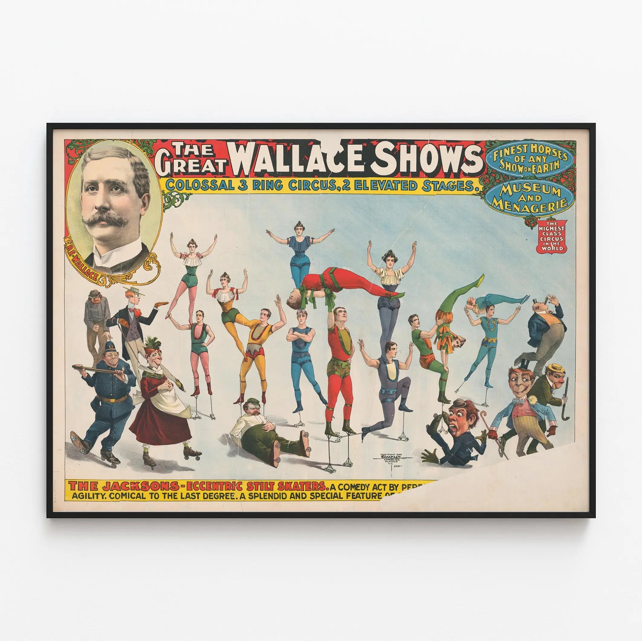 Découvrez cette affiche vintage originale mettant en scène le spectacle du Great Wallace Shows, un cirque colossal à trois pistes et deux scènes surélevées, emblématique de l'époque du cirque traditionnel. Cette décoration murale unique illustre avec éclat le numéro humoristique et acrobatique des Jacksons, célèbres patineurs sur échasses. L'affiche présente des personnages en tenue colorée, certains réalisés comme des acrobates en mouvement, d'autres en personnages comiques, capturant l'esprit festif et excentrique de cette troupe. L'en-tête en lettres blanches et jaunes sur un fond rouge et bleu, ainsi que les ornements décoratifs autour du portrait de B.E. Wallace, ajoutent une touche d'authenticité à ce poster de cirque ancien. Ce tableau mural est idéal pour les amateurs de décoration rétro, les passionnés d'histoire du cirque ou ceux qui souhaitent apporter une ambiance vintage et originale à leur intérieur. Avec son mélange de couleurs vives et de détails minutieux, cette affiche promotionnelle représente un élément d'art mural rare qui reflète la bravoure et la fantaisie des spectacles ambulants du début du 20ème siècle. Parfait pour un salon, un bureau ou une salle de jeux, ce poster se distingue par son côté narratif et sa capacité à capturer un moment important de la culture populaire. Offrez-vous cette pièce de décoration murale intemporelle, riche en détails et en caractère, qui promet d’animer vos murs et de susciter la curiosité de vos visiteurs.