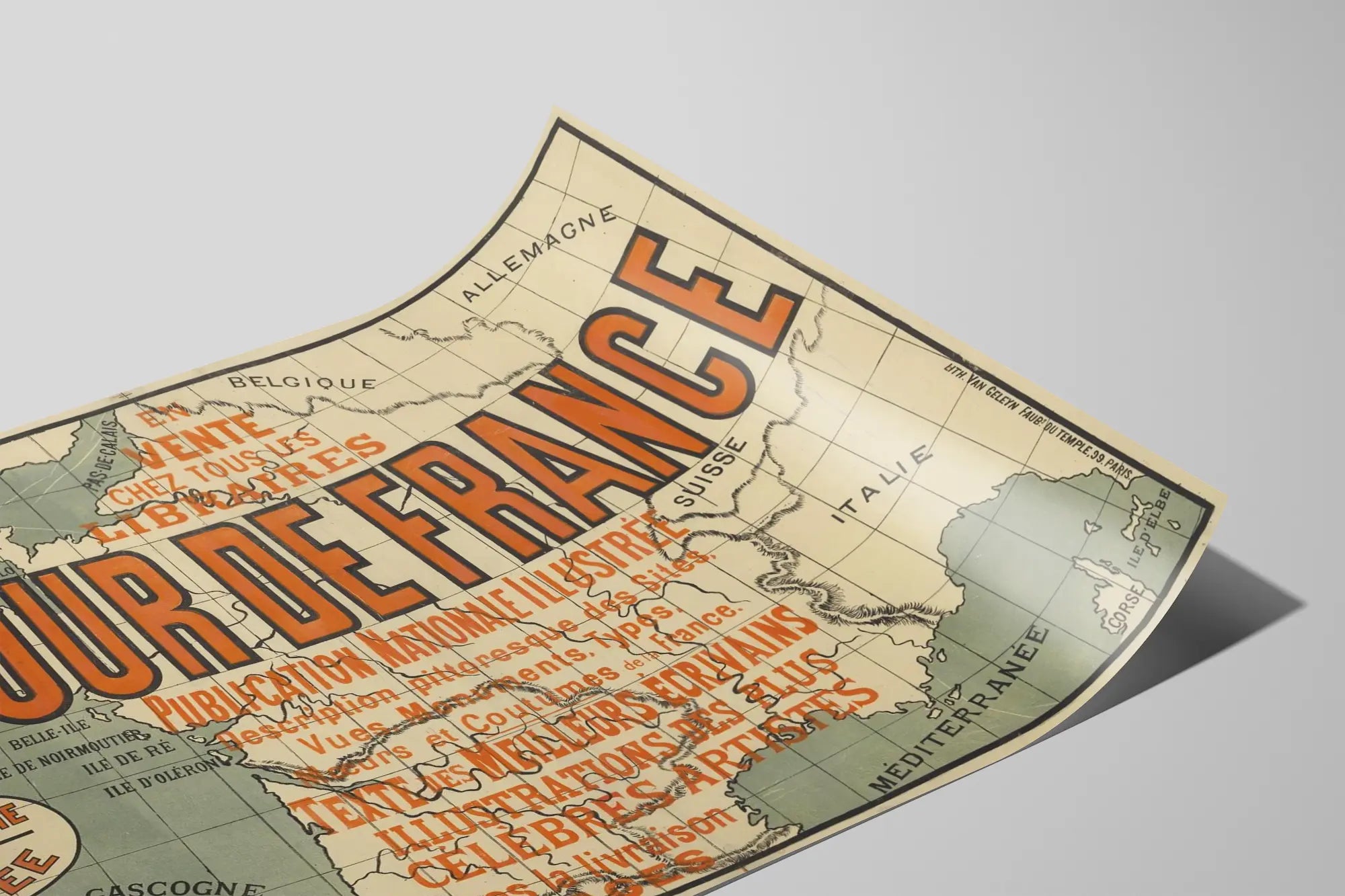 Apportez une touche d'authenticité et d'histoire à votre décoration murale avec cette affiche vintage représentant une carte ancienne du Tour de France. Cette décoration murale met en avant les régions françaises avec leurs principales îles et frontières, illustrant également les pays voisins tels que l'Angleterre, la Belgique, l'Allemagne, la Suisse, l'Italie et l'Espagne. Le fond est un dégradé de couleurs douces vertes et grises, avec des contours marqués en noir, accentuant le style rétro de cette illustration. L’affiche montre une carte géographique avec des inscriptions en lettres capitales orange et noires qui soulignent le titre "LE TOUR DE FRANCE" en grand, attirant immédiatement le regard. Plusieurs informations textuelles sont également présentes en orange, indiquant qu’il s’agit d’une publication nationale illustrée, décrivant des sites, monuments, types, moeurs et coutumes de France, enrichie par des textes d’écrivains renommés et des illustrations d’artistes célèbres. Ce poster donne un aspect culturel fort qui plaira aux amateurs d’histoire et de patrimoine français. Cette décoration murale conviendra parfaitement dans un salon, un bureau ou une bibliothèque pour créer une atmosphère nostalgique et éducative. Elle s'adresse aux passionnés de géographie, d'histoire ainsi qu'aux amateurs de design vintage. Le style graphique et les couleurs assurent une intégration harmonieuse dans une ambiance rétro ou classique, offrant une belle mise en valeur des territoires et emblèmes régionaux français. La carte met en relief les différentes régions françaises ainsi que leurs îles, telles que Belle-Île, Île de Ré, Île d'Oléron et la Corse, renforçant l’importance des paysages et la diversité paysagère française. L’utilisation d’une vieille typographie et du concept de carte ancienne offre un charme indéniable, parfait pour une décoration murale unique et originale. Cette affiche pourra aussi faire office de cadeau pour les passionnés de culture française et d’histoire géographique. En combinant art, géographie et atmosphère vintage, ce poster "Le Tour de France" enrichira votre intérieur d'un élément décoratif de caractère. Idéal pour les murs vides cherchant une pièce singulière qui invite à la découverte et à l’évocation des richesses culturelles et naturelles du pays. Profitez de cette carte pour transmettre un petit bout de patrimoine français dans votre espace de vie.