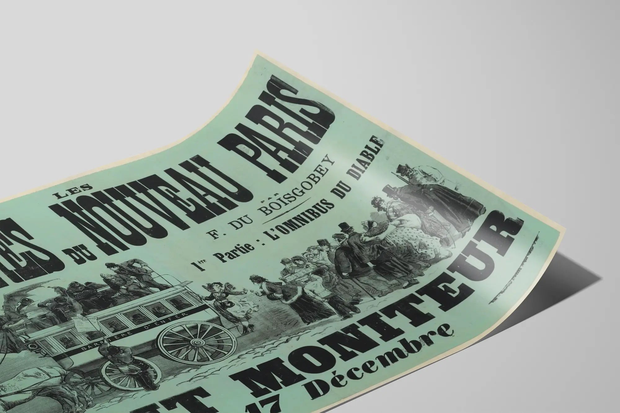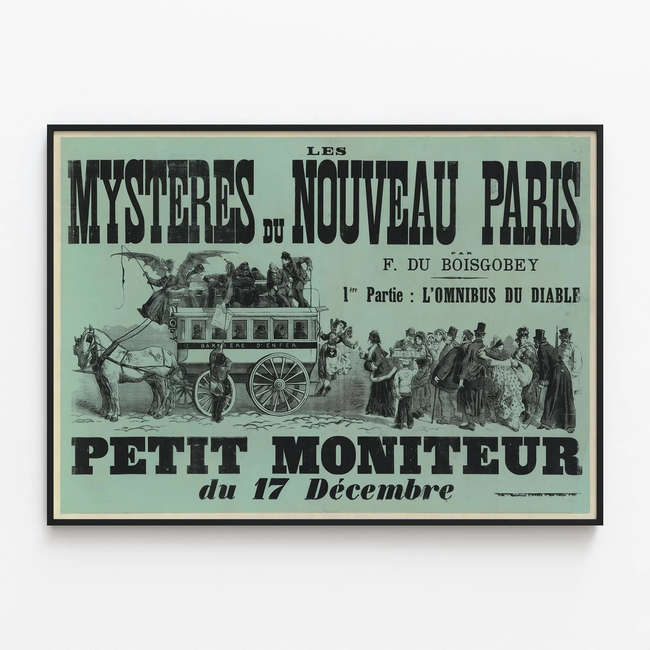 Cette affiche vintage intitulée "Les Mystères du Nouveau Paris", réalisée par F. du Boisgobey, est une pièce de décoration murale qui saura séduire les amateurs d'art historique et de graphisme ancien. Présentant une scène animée autour d'un omnibus intitulé "L'Omnibus du Diable", cette affiche combine texte et illustration dans un style typique du XIXe siècle, qui rappelle les affiches de l'époque et les journaux illustrés.