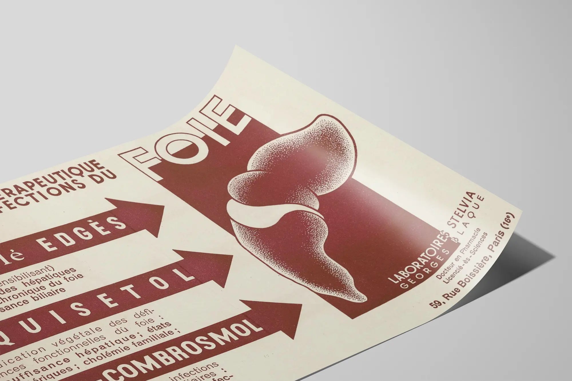 Deze vintage wanddecoratieposter benadrukt een eenvoudig en strak grafisch ontwerp, gericht op de geneeskracht van leveraandoeningen. Ideaal voor liefhebbers van vintage wanddecoratie of medische professionals die een poster met een retro sfeer zoeken, toont deze affiche drie therapeutische middelen: Granulaat Edgès, Equisetol en Carbo-Combrosmol. Deze geneesmiddelen worden aanbevolen voor verschillende leveraandoeningen, waaronder leververstopping, chronische levercongestie, galweginsufficiëntie, en gastro-intestinale en galinfecties zoals eenvoudige hepatitis, infectieuze geelzucht, angiocholitis en galblaasontsteking. De grafische stijl van deze affiche speelt met geometrische vormen, richtingspijlen en een vereenvoudigd schema van de lever, wat zorgt voor een duidelijk en functioneel beeld. Het kleurenpalet beperkt zich tot een donkerbruine tint op een lichte achtergrond, wat de klassieke vintage uitstraling versterkt en gemakkelijk integreert in een authentieke binnenmuurdecoratie. Deze oude poster is een uniek decoratiestuk dat de aandacht trekt door zijn retrostijl en informatieve boodschap. Perfect om een artsenkamer, wachtkamer of elke ruimte met een medisch of vintage thema te personaliseren, brengt dit schilderij een tijdscharme die de details van traditionele medische reclame benadrukt. Elk element van de tekst is zorgvuldig geïntegreerd in het ontwerp, wat bijdraagt aan een esthetiek die zowel informatief als decoratief is. Door te kiezen voor deze affiche, kiest u voor een decoratief object dat grafische kunst en medische geschiedenis combineert, ideaal om een interieur te verrijken met een originele en culturele toets.