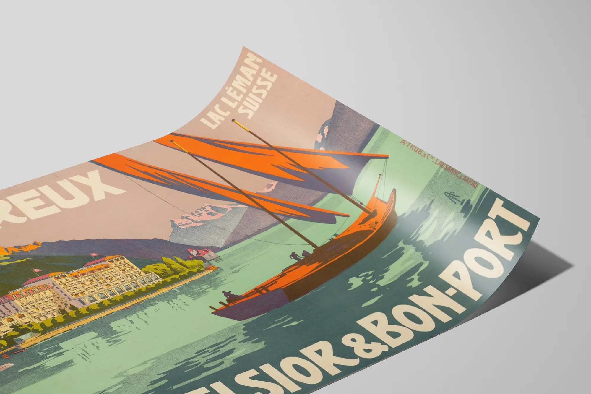 Ontdek dit vintage affiche met de prachtige stad Montreux, gelegen aan de oever van het Meer van Genève in Zwitserland. Deze wanddecoratie poster roept met charme en elegantie het Grand Hotel Excelsior en het Hotel Bon-Port op, twee iconische locaties uit de regio. De grafische compositie benadrukt een rustgevend meerlandschap, met op de voorgrond een zeilboot met oranje-rode zeilen die prachtig contrasteert met de kalme weerspiegeling van het meer. Op de achtergrond bieden de Zwitserse bergen een indrukwekkend decor, met hun besneeuwde toppen, die de natuurlijke rijkdom van de regio onderstrepen. De grote hoofdletters kondigen « MONTREUX » en « GRAND HOTEL EXCELSIOR & BON-PORT » aan, wat de retrostijl van deze affiche versterkt, die doet denken aan reisaffiches uit de jaren 1920-1930. Deze wanddecoratie is ideaal voor liefhebbers van vintage en voor liefhebbers van berglandschappen; ze brengt een vleugje elegantie en nostalgie in uw interieur. Geef uw woonkamer, kantoor of slaapkamer een unieke decoratieve accent met dit schilderij dat kunst en Zwitsers toeristisch erfgoed combineert. Deze affiche is ook een uitstekende keuze om een locatie te decoreren die te maken heeft met reizen of gastvrijheid, en creëert een warme, uitnodigende sfeer. Het gedetailleerde grafische ontwerp en de evenwichtige kleuren maken van dit stuk een echt verzamelobject voor een verfijnde wanddecoratie.