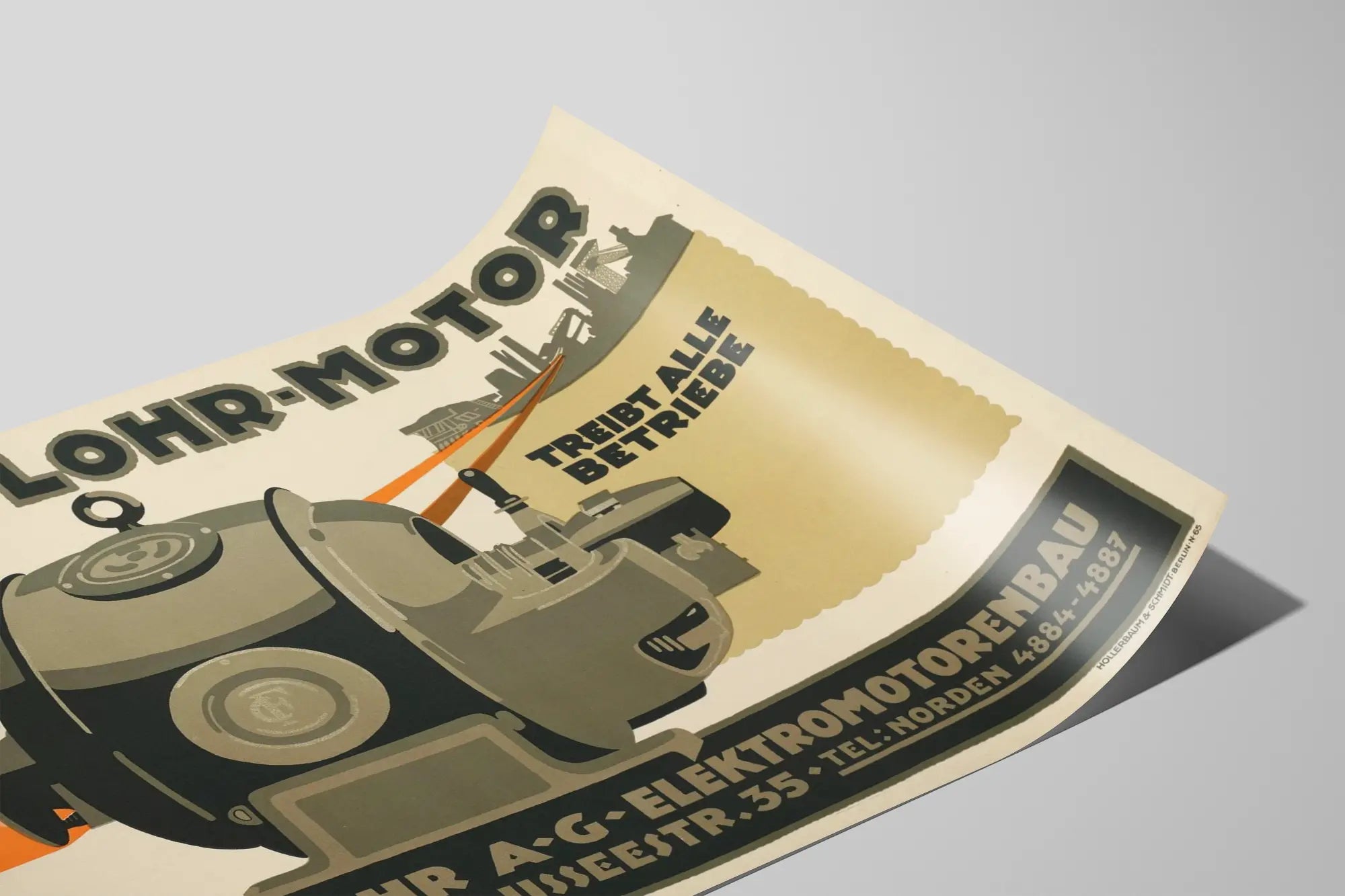 Deze muurposter is ideaal voor een interieurdecoratie met een industrieel of vintage thema, en voegt een authentieke toets van techniek en technische geschiedenis toe aan een modernistische of retro ruimte. Perfect als decoratief affiche voor liefhebbers van technisch design, industriële geschiedenis of zeldzame objecten, deze afbeelding inspireert zowel functionaliteit als mechanische esthetiek. De duidelijk zichtbare Duitse tekst benadrukt de retro en authentieke stijl van deze muurdecoratie, terwijl het adres en de contactgegevens van het bedrijf de historische uitstraling versterken.