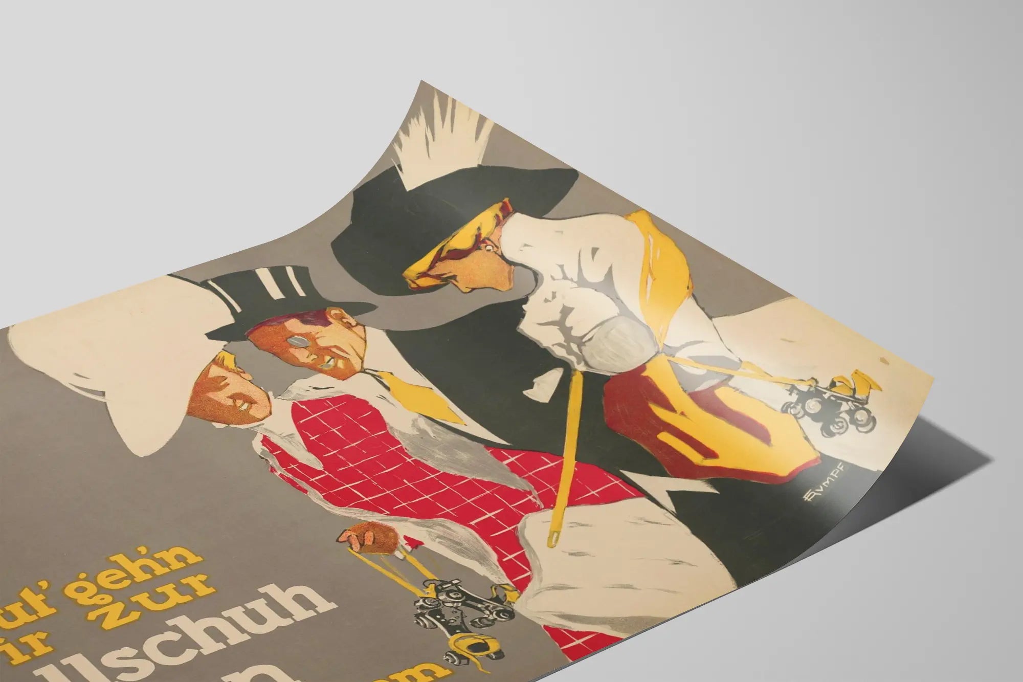 Deze boeiende vintage poster getiteld « Heute gehen wir zur Rollschuh Bahn Kurfürstendamm » is een uniek wanddecoratiestuk dat een retro en elegante toets aan elk interieur toevoegt. Het beeld toont drie personen gekleed in verfijnde stijl, die een verfijnde en feestelijke sfeer oproepen, vintage en stedelijk. De aanwezigheid van rolschaatsen in de handen van de personages benadrukt het dynamische en speelse thema van de decoratie, perfect voor liefhebbers van vintage vrijetijdsbestedingen en grafische kunst. Deze poster met ingetogen tinten en een strakke compositie past gemakkelijk bij verschillende interieurstijlen, van klassiek tot modern, dankzij de overheersende kleuren grijs, geel en rood. Het visuele effect wordt versterkt door het gebruik van scherpe contouren en vlakke gekleurde gebieden, kenmerkend voor affiches uit vervlogen tijden, vooral bedoeld om een locatie of een cultureel evenement te accentueren. Ideaal om een vintage sfeer te creëren in een woonkamer, kantoor of zelfs in een commerciële ruimte, is dit wandpaneel een uitnodiging om de geschiedenis van rolschaatsen en het levendige sociale leven in de stad te ontdekken. Het kan ook perfect een sportzaal of recreatieruimte decoreren, waardoor een authentiek en artistiek karakter wordt toegevoegd. Kiezen voor deze poster betekent kiezen voor een muurdecoratie vol karakter, die nieuwsgierigheid en bewondering kan opwekken door zijn boodschap en algemene esthetiek. Een decoratief affiche dat elegantie, vreugde en nostalgie prachtig combineert, ideaal voor liefhebbers van stedelijke cultuur en historische grafische kunst.