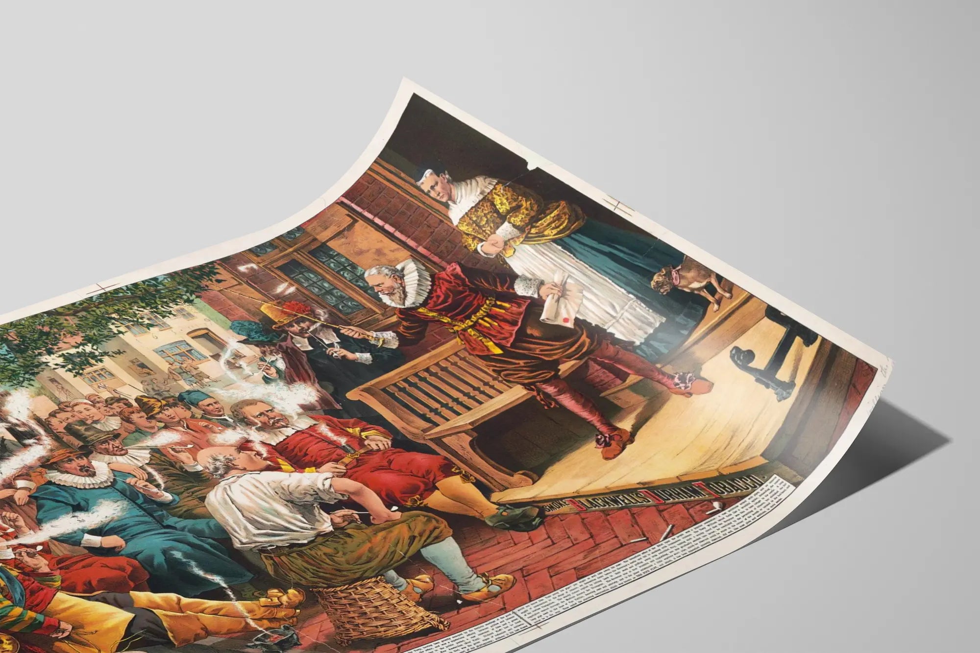 Deze vintage poster getiteld "Smoke Blackwell's Durham" illustre een opmerkelijk voorval in de geschiedenis van Nieuw Amsterdam, het oude New York. Perfect voor een unieke muurdecoratie, deze kleurrijke voorstelling vangt een levendige scène waarin meerdere personages uit de zeventiende eeuw tabak roken van Blackwell's Durham. De compositie toont een groep mannen gekleed in historische kostuums, sommigen zittend, anderen staand, allen met zichtbare rookwolken, wat het belang van dit tabakmerk door de geschiedenis heen benadrukt. Op de achtergrond kijken oplettende toeschouwers naar de scène, wat de historische authenticiteit van de poster versterkt. Het architecturale kader en het meubilair, zoals de houten bank, versterken de sfeer van weleer, ideaal voor een retro of historische decoratiestijl. Deze oude illustratieposter past perfect in een interieur dat een vintage en cultureel rijke stijl zoekt, of het nu een woonkamer, kantoor of ontspanningsruimte is. De precieze schilderstijl en de levendige kleuren brengen een vleugje elegantie en authenticiteit. De Smoke Blackwell's Durham poster is een opvallende keuze voor liefhebbers van klassieke muurdecoratie, Amerikaanse geschiedenis enthousiastelingen, of iedereen die zijn interieur wil verrijken met een kunstwerk dat een anekdote uit het verleden vertelt. Geïntegreerd in een passend frame, draagt dit decoratieve werk bij aan een warme en gezellige sfeer, door kunst en erfgoed te combineren. Deze poster kan ook harmonieus worden gecombineerd met andere historische affiches of schilderijen om een thematische muurcollectie te vormen.